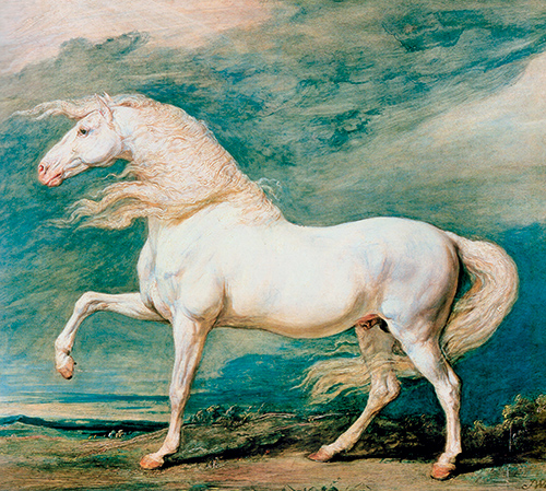 詹姆斯·沃德(1769-1859) 白色種馬阿多尼斯,木材油畫 現(xiàn)為私人收藏 這匹白色種馬叫阿多尼斯,是大不列顛及愛爾蘭聯(lián)合王國(guó)的國(guó)王喬治三世(George III,1738-1820)最喜歡的一匹軍馬。喬治三世國(guó)王好武,一生征戰(zhàn)無數(shù),在位59年。統(tǒng)治期間,大不列顛在七年戰(zhàn)爭(zhēng)中擊敗法國(guó),并使大不列顛壓倒歐洲各國(guó),成功支配著北美洲及印度地區(qū)。 沃德在這幅畫中展現(xiàn)出了軍馬阿多尼斯無所畏懼、充滿英雄氣概的浪漫主義色彩。白馬與遠(yuǎn)處地平線上風(fēng)雨如磐的天空形成強(qiáng)烈的色彩對(duì)比,同時(shí)也形成了真實(shí)與虛幻的對(duì)照,使得白馬的形象更加突出立體。 詹姆斯·沃德所畫的《白色種馬》,與喬治·斯塔布斯繪制的《獅子與馬》的系列之間形成了一個(gè)有趣的對(duì)比。從馬的角度來看,盡管此幅圖畫上繪制了一些陰暗的元素,但在結(jié)構(gòu)和整體效果上還是表現(xiàn)得很完整的。沃德和藝術(shù)家索里·吉爾平(1733-1807)以斯塔布斯的畫為樣本,還畫了一幅《驚恐的馬》,該畫展現(xiàn)的是一個(gè)略帶恐怖與戲劇性的主題。當(dāng)一匹馬以簡(jiǎn)潔的形象出現(xiàn)在世人面前時(shí),就迅速得到了人們的喜愛。 |
