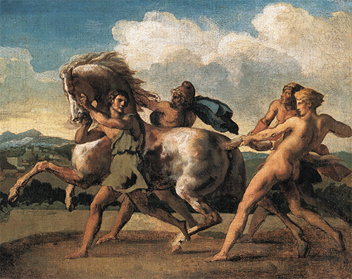泰奧多爾·席里柯(1791-1824) 奴隸與馬的較量,布面油畫。 私人藏品 泰奧多爾·席里柯(1791-1824)出生在法國諾曼底,是19世紀初期法國浪漫主義畫派的先驅(qū),他的眾多代表作均以馬為主角??梢哉f,在法國這樣一個終日氳氤著香水氣味的城市,畫家的成長會更為精致。作為頗有經(jīng)濟頭腦的法學(xué)家的兒子,18歲的席里柯中學(xué)畢業(yè)后即進入當?shù)刂嫾铱枴ぞS爾內(nèi)的畫室,不覺間決定了一生的事業(yè)。而與父親的期望恰恰相韙,這似乎是不可違拗的天才的命運。 通常,純?yōu)樗囆g(shù)的藝術(shù)家總是貧困的,然而席里柯卻擁有一個富足的家庭,并不為金錢煩惱。年輕時,他是一名兢兢業(yè)業(yè)、嚴謹教學(xué)的美術(shù)老師,可惜他的才華并沒有得到校方和學(xué)生的認可。心中對藝術(shù)的渴望,讓他毅然決然離開了課堂,選擇去巴黎留學(xué)。留學(xué)期間,他很幸運地在凡爾賽宮汲取靈感,開始了自己的創(chuàng)作之路。偶然的一次機會,他發(fā)現(xiàn)了凡爾賽宮皇家馬廄,自幼就喜愛馴馬表演的他很快就被這里所深深地吸引,也獲得了有關(guān)馬匹解剖及馬術(shù)行為學(xué)方面的專業(yè)知識,從此與馬結(jié)下了深深的緣分。 席里柯畫馬的作品達千幅,他在用自己的方式表達對馬的癡愛。然而,他一生與馬相伴的生活并未持續(xù)多久,慢性結(jié)核的病痛無情地吞噬著他日漸衰退的體力和精力。緊接著,這種痛苦在一次騎馬訓(xùn)練中終結(jié),他不幸墜馬身亡,享年33歲。 《奴隸與馬的較量》的創(chuàng)作靈感,來源于席里柯 1816 年之后的生活經(jīng)歷。那一年,拿破侖在法國發(fā)動的戰(zhàn)爭宣告失敗,面對處于戰(zhàn)亂中的故鄉(xiāng),他選擇了離開,并在意大利羅馬定居。在羅馬,他領(lǐng)略到了異國風(fēng)情的魅力,也平生第一次觀賞到羅馬狂歡節(jié)中著名的表演項目“裸馬賽會”(指沒有騎手參與的賽馬活動)。壯觀的表演場面再次激發(fā)他創(chuàng)作了一系列以“表現(xiàn)人類與馬之間力量與控制”為主題的畫作,這幅作品就是當時具有代表性的主題創(chuàng)作。畫作于 1817 年面世,是席里柯早期的成名作品。它直觀清晰地表達了歐洲原始部落的奴隸掌控馬匹的方式,還借助富有張力的躍馬動作和奴隸們生動的造型,間接地使讀者身臨其境地感受到畫家在創(chuàng)作畫作時的動蕩不安、沉郁苦悶的內(nèi)心世界。 |
