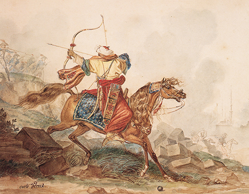 卡爾勒·韋爾內(nèi)(1758-1836) 開弓射箭的馬穆魯克騎兵,水彩畫。 現(xiàn)由美國弗吉尼亞州阿珀維爾的保羅·梅隆夫婦私人收藏 卡爾勒·韋爾內(nèi)出生在法國波爾多的一個藝術(shù)世家,他的爸爸約瑟夫·克勞德·韋爾內(nèi)是早期著名的油畫大師。卡爾勒·韋爾內(nèi)延續(xù)了家族的藝術(shù)基因,子承父業(yè),并青出于藍(lán)而勝于藍(lán),年僅 24 歲便贏得法國國家藝術(shù)獎學(xué)金“羅馬大獎”,該獎項(xiàng)獲得者可以得到法國國王資助,前往藝術(shù)之都羅馬進(jìn)行深造。他年輕時一度熱衷法國大革命,在每個靈感迸發(fā)的時刻,總是能創(chuàng)作出令世人稱贊的佳作。在革命后期,因其大氣磅礴的畫作風(fēng)格,他深得拿破侖賞識。直到1808年,50歲的韋爾內(nèi)被拿破侖授予“法國榮譽(yù)軍團(tuán)勛章”,并在之后成為了國王路易十七的御用畫家。 韋爾內(nèi)還有另外一個身份——狂熱的馬術(shù)愛好者。他對馬術(shù)的這份熱情不停地通過筆下的畫作傳遞,他的作品里展現(xiàn)了馬匹在各種狀態(tài)下的颯爽英姿,諸如賽馬、狩獵或者戰(zhàn)爭中馬的肖像,畫面細(xì)膩而張揚(yáng),情緒渲染力極強(qiáng)。他藝術(shù)造詣極深,擅長油畫、水彩畫和石版畫。在后期的作品里,韋爾內(nèi)創(chuàng)作了大量展現(xiàn)當(dāng)時市井風(fēng)俗的版畫,描繪了彼時法國的馬匹交易市場以及人情百態(tài)。 這幅作品,為我們呈現(xiàn)了埃及馬穆魯克騎兵征戰(zhàn)沙場時的勇猛形象。馬穆魯克騎兵也稱奴隸兵,因其早期的騎兵大多是被奴隸販子強(qiáng)制販賣至中東地區(qū)后成為雇傭兵,由此而得名。到拿破侖時代,馬穆魯克騎兵隊(duì)逐漸發(fā)展為一支令人聞風(fēng)喪膽的軍隊(duì),創(chuàng)立并鞏固了馬穆魯克貴族的統(tǒng)治地位。值得一提的是,所有的馬穆魯克騎兵都沒有結(jié)婚,他們擁有下一代的方式是通過有償購買俄羅斯南部農(nóng)民家庭的孩子來實(shí)現(xiàn)。他們培養(yǎng)這些孩子成為虔誠的伊斯蘭教徒,肩負(fù)著成為一名優(yōu)秀的騎兵且隨時為戰(zhàn)爭獻(xiàn)身的使命。就這樣,馬穆魯克的貴族時代,在埃及持續(xù)了五個半世紀(jì),階級地位從未有過絲毫動搖。 再回到韋爾內(nèi)的畫作中來,馬穆魯克騎兵身著華麗服飾,與之相伴的戰(zhàn)馬也佩帶精致的頭飾及鞍飾,配合主人完成了獨(dú)特的撤退掩護(hù)戰(zhàn)術(shù)。據(jù)傳,被雇傭的馬穆魯克騎兵中有一部分塞西亞人,他們并肩作戰(zhàn),技藝高超,可在軍隊(duì)撤退時,以上身回轉(zhuǎn)的方式將弓箭高舉過肩膀,完成精準(zhǔn)有力的一箭。韋爾內(nèi)用畫筆塑造的這位塞西亞奴隸兵微傾身體,正全力以赴攻擊后方的敵軍,他犀利的眼神,無疑是睿智和力量的象征。 |