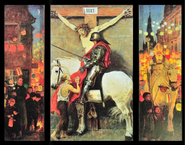 尤利烏斯·保羅·容漢斯(1876 - 1958 年) 圣馬丁三聯(lián)畫 1934 - 1936 年 創(chuàng)作 布面油畫 155×192 cm 私人收藏品 尤利烏斯·保羅·容漢斯是德國(guó)知名的動(dòng)物、風(fēng)景畫的領(lǐng)軍人物,由于其崇尚納粹政治,所以也被稱為納粹藝術(shù)家,是希特勒跟前的紅人。實(shí)際上,相比政治題材的作品,容漢斯更擅長(zhǎng)風(fēng)景畫、田園風(fēng)光和農(nóng)作場(chǎng)景,這些作品體現(xiàn)了工作的辛苦及對(duì)祖國(guó)的自豪之情。 而這幅三聯(lián)畫卻罕見地以宗教故事為題材,這位忠實(shí)于納粹黨的藝術(shù)家并未將任何德意志模式強(qiáng)加進(jìn)來(lái)。畫作中間描繪了圣馬丁將自己的斗篷一分為二,將一半分給一名乞丐的情景。兩側(cè)則描繪了圣馬丁節(jié)日的游行隊(duì)伍,直到今天,這仍是萊茵河地區(qū)的風(fēng)俗。在這幅畫作中,中央是一匹風(fēng)姿俊美的白馬,類似于法國(guó)的佩爾什馬。佩爾什馬屬于冷血重型馬,發(fā)源于法國(guó)諾曼底的拉佩什地區(qū),一些佩爾什馬引用過(guò)阿拉伯馬的血統(tǒng),這種馬吃苦耐勞,起初被廣泛用作戰(zhàn)馬,后逐漸擴(kuò)展為農(nóng)用馬和乘用馬。 在容漢斯的眾多作品中對(duì)于馬的描繪占據(jù)了其繪畫題材的較大比例,不管是在農(nóng)作工作中的馬、牧場(chǎng)上奔跑的馬還是和人在一起的馬,其形象都栩栩如生,充滿了靈動(dòng)感,也展現(xiàn)了德國(guó)鄉(xiāng)間恬適的田園生活。 |