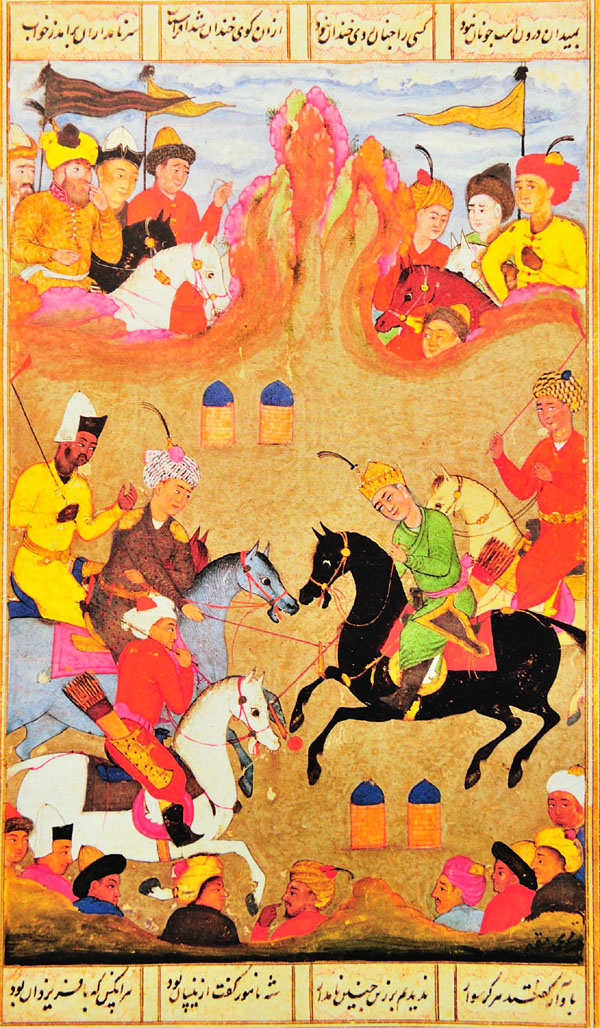 沙阿版本(國王的書)中的一幅小裝飾畫,1670 年左右,紙面水粉畫,私人收藏品 馬球是世界上最古老、最耗力的馬術(shù)運動形式中的一種。它應(yīng)該產(chǎn)生于公元前5世紀波斯國。當時,波斯馬品質(zhì)極佳,嬌小但行動迅速,激起了鄰近游牧民族斯堪特人的忌妒。 古希臘羅馬時期,馬球運動盛行于東方國家。Polo 一詞源自藏語pulo,意指一種植物的根莖。最初的馬球就是用這種植物的根莖雕刻而成的。而它在中亞各地區(qū)發(fā)展成為多種適于在荒野進行的運動,比如馬背叼羊賽,至今阿富汗仍舉行這種比賽。比賽規(guī)則簡單,最多可以有100 人參賽,大家騎馬奔馳,爭搶一只羊。 大概是來自西北的穆斯林和東部的中國人將馬球運動帶入了印度。一經(jīng)傳入,它迅速受到印度人的歡迎,在印度最東部的小城邦曼尼普爾非常流行。當?shù)剡€出產(chǎn)了一種小型馬,身材嬌小,行動敏捷,非常適合馬球運動。 |