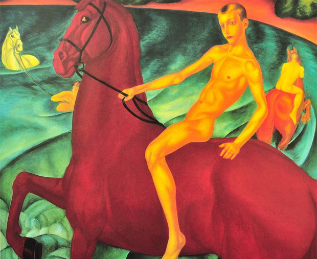 紅馬之浴【1912年】 古斯馬?佩特羅-沃德金 布面油畫:160×186cm 國立特列季亞科夫畫廊,莫斯科 圍繞這幅非凡的作品有許多不同的解釋與理解,但該作品中這匹巨大的赤兔馬所表現出來的壯觀的氣勢是無可爭議的。這也是觀賞者看到這幅巨大的布畫時的第一印象。特別是這匹赤兔馬所展示的熱烈、活潑的性格,所蘊含的精力,輕微轉向觀賞者的頭顱和它充滿魅力、生動的眼神非常吸引人。這幅畫是一幅真正具有吸引力的作品:它提出問題,卻沒有給出明確的答案。 佩特羅-沃德金的所有作品都展現了自然的精神。他不僅將宗教作為作品題材,而且也創(chuàng)作了大量以世俗內容為主題的作品。但后者意義更深遠,并激發(fā)人們超越素材的反省及沉思。紅馬之浴這幅畫色彩層次變化非常明顯,先將位于畫面中心位置的馬兒著以明亮的鮮紅色,當它潛入象征精神的湖水中后淡為橙色,最后經過宗教的洗滌之后則變?yōu)榘咨?/div> |