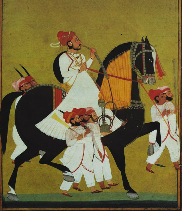 印度焦特布爾的昆巴沃特?凱薩里?辛格在仆傭環(huán)簇中叼著水煙騎馬出行 1810-1820年左右 紙面水粉畫 30.1cm×22 cm 倫敦,皇家亞洲協(xié)會(huì),托德收藏館 出色的駿馬前肢高抬,旁若無人的自滿態(tài)度與其背上高傲威嚴(yán)的昆巴沃特?凱薩里?辛格如出一轍。他坐在馬背上紋絲不動(dòng),吸著水煙,表現(xiàn)出貴族特有的冷漠與寬容。而他靜止不動(dòng)的坐姿則突出了坐騎所具有的巨大力量。那時(shí),貴族騎師按照非正式的禮節(jié)帶著隨從騎著駿馬出行的題材廣受歡迎。同時(shí),這類題材也突顯了他們的高大形象。 印度氣候復(fù)雜,草場(chǎng)條件不好,不適于養(yǎng)馬。盡管如此,印度仍出產(chǎn)了幾種值得關(guān)注的馬種,例如馬爾瓦爾馬。這種馬與眾不同,擁有典型的內(nèi)翻耳,深受印度西北部傳統(tǒng)統(tǒng)治者的喜愛,受到了幾乎與它們的貴族騎師同等的尊重。馬爾瓦爾馬大概源自非常普遍的蒙古矮種馬,是蒙古矮種馬與土庫(kù)曼斯坦的沙漠馬及里海地區(qū)的阿拉伯馬雜交的結(jié)果。 |