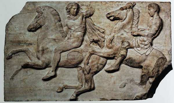 帕特農(nóng)神廟西面的駿馬浮雕【公元前438-432年左右】 大理石,高100 cm ;倫敦,大英博物館 希臘的土壤和氣候不太適合飼養(yǎng)繁殖馬匹。盡管如此,喜愛駿馬的古希臘人仍從波斯人和馬其頓人購買種馬,用以與本地品種雜交。馬匹繁育中心是位于希臘東北部的塞薩利。純種塞薩利馬就是由本地馬匹與東方品種雜交產(chǎn)生的。 現(xiàn)存最早有關(guān)馬的文獻(xiàn)來自一位名叫西蒙的希臘馬師,但其所寫的絕大部分內(nèi)容現(xiàn)已丟失。后來,希臘著名歷史學(xué)家和作家色諾芬(約公元前430-356年)也對此進(jìn)行了研究記載。色諾芬在其《馬術(shù)》中詳細(xì)描述了一匹體格良好的駿馬該有的樣貌,并為此列舉了30多項(xiàng)馬匹體格合格的標(biāo)準(zhǔn)。 頗有意思地是,色諾芬和西蒙對良駒的特點(diǎn)看法一致。而其后的作品則遵循了他們的規(guī)定。帕特農(nóng)神廟西面的這幅駿馬浮雕上充滿力量的駿馬似乎充分切合色諾芬的描述。盡管雕刻在由沉重的大理石修建的建筑物上,但它們看起來栩栩如生,極其敏捷靈巧并富有端莊典雅之美,與文獻(xiàn)中有關(guān)塞薩利馬的描述如出一轍。 |
