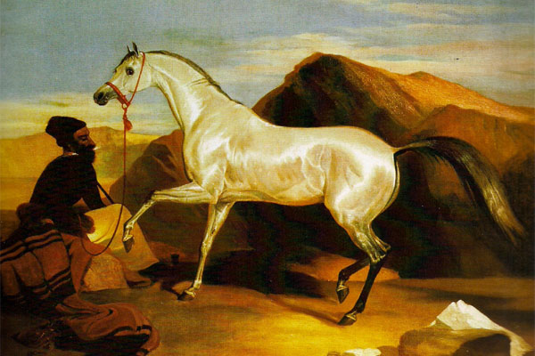 愛德溫·蘭西爾(1802-1873) 阿拉伯牡馬1824年 布面油畫69.6×90.2cm倫敦,羅伊·邁爾斯繪畫精品公司 至少自公元前3000年以來,阿拉伯馬就與人類生活在一起了,它確切起源地始終無法考證。圍繞這一古老馬種,產(chǎn)生了許多傳說,更為其蒙上了一層面紗。然而,阿拉伯馬的起源與生活在阿拉伯沙漠的貝都英人部落密不可分。 對于伊斯蘭教徒來說,阿拉伯馬是真神阿拉所賜的禮物。馬匹深受過著游牧生活的貝都英人的尊重,同時也是他們?nèi)粘I娑窢幍谋匦杵?。他們非常重視自己的沙漠馬,將其中最好的配對,以確保這種馬匹未來仍具有最優(yōu)秀的特性。這種做法以及與外界隔絕的地理位置導(dǎo)致阿拉伯馬得以保持了“純種”。 英國的動物畫家愛德溫-蘭西爾被阿拉伯馬的自然美所吸引,常以它們作為繪畫主題。這幅畫中體態(tài)優(yōu)美的白色牡馬體現(xiàn)了阿拉伯馬所有優(yōu)雅的特性。而它出色的美并未掩蓋它的堅毅果敢與聰慧。在該品種馬的早期發(fā)展階段,牝馬遠(yuǎn)多于牡馬。這說明,牡馬始終不渝地對自己的主人保持忠誠,戰(zhàn)爭中一聲不吭,因此成為貝都英人最好的武器。 |