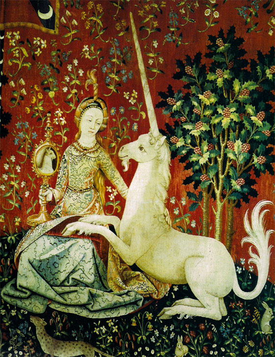 法國巴黎,國立中世紀(jì)博物館 創(chuàng)作時(shí)間:15世紀(jì),作品材質(zhì):哥白林織花壁毯 獨(dú)角獸在傳說中通常被描述為一種具有馬身,頭頂有只單角的動(dòng)物。也有傳說獨(dú)角獸具有羚羊后腿,獅子尾巴和山羊胡子。在中世紀(jì)基督教界,獨(dú)角獸象征宗教和長久。一些希伯來圣經(jīng)的早期譯本中曾經(jīng)講到獨(dú)角獸,并且說它具有神職,象征著純潔。雖然當(dāng)它身陷絕境時(shí)會(huì)兇殘搏斗,但人們相信,獨(dú)角獸會(huì)被純潔的少女所馴服,因此許多中世紀(jì)藝術(shù),包括木刻,燈彩,以及織錦等常出現(xiàn)有關(guān)獨(dú)角獸將頭溫柔地靠在少女懷中的描述。 有些基督教傳說獨(dú)角獸總是和圣母瑪麗亞在一起,說它就是救世主耶穌。依據(jù)傳說獨(dú)角獸之角極其珍貴,具有可以治愈一切疾病的神奇功力。人們?yōu)榱朔蓝?,曾盛行使用?dú)角制成的杯子。由于獨(dú)角獸象征了純潔、勇敢、善良及尊嚴(yán)等品質(zhì),它的圖形紋章風(fēng)行于中世紀(jì)。 這幅壁毯是一組哥白林壁毯中的一幅。其中的五幅分別表現(xiàn)了人的五種知覺,第六幅《視覺》則表現(xiàn)了愛與愿望。 |