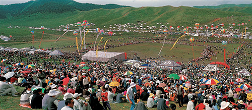 西藏,是一個具有神圣感的地方。處在高原清凈之地,人的心也異常干凈,像是受到了洗禮一般。初來乍到的旅人該怎樣才能更快地走進、了解這里淳樸而高貴的藏民的生活當中呢?或許參加一場賽馬會是最好的選擇。 愛馬是牧民的天性,在藏民眼里“馬雖然長著畜牲的毛皮,卻具有神的靈氣和感情”。賽馬不僅是農(nóng)牧民閑暇之余的集會、交流農(nóng)牧業(yè)生產(chǎn)經(jīng)驗的場所,也是藏民族精神的展示。按藏族傳統(tǒng),在喜慶的節(jié)日、集會上都要舉行賽馬,以助雅興。在賽馬會上有馬術(shù)、馬技等比賽,還有精彩的文藝匯演、民歌大賽、民族服飾展演。 在藏族地區(qū),有些地方的賽馬活動最初是檢閱騎兵隊伍的一種形式,源于藏族英雄格薩爾每次出征前要舉行跑馬射箭的習俗。生于西藏高原的格薩爾,抵御過外來的入侵,捍衛(wèi)了本土,并開疆拓土,創(chuàng)建嶺國,戰(zhàn)功卓著,為民族的統(tǒng)一作出了巨大貢獻。因此,在藏民族的英雄崇拜信仰中,力量、勇敢、智慧成為向往、崇拜的對象,成為衡量男人價值的標志。 賽馬首先要給駿馬精心打扮、除給馬備上精美的鞍鞘、籠頭外,還要給馬額插彩花,脖披彩綢,尾巴邊扎梳成辮形。 有些地方則騎著光背馬參賽,以增加比賽的難度。參賽的騎手也要精心打扮,穿上華美的彩衣或緊身服,戴上紅纓帽、大頭帽或金花帽,背起叉子槍,顯得格外俊俏瀟灑。 賽馬的形式種類不一,以距離來說,一般從十里到幾十里,也有十里以下的中程賽或一二里的短程賽;以馬來說,有駿馬賽、馬駒賽、母馬賽;以騎手來說,有成人賽、孩子賽、姑娘賽等;也有無騎手的駿馬賽,以先到達終點者為勝,有時也評判駿馬的身架走法,有的還比賽駿馬和騎手的衣飾。此外,還有表現(xiàn)高超騎術(shù)和技巧性的馬上運動如馬上拾哈達、馬上敬青稞酒、馬上斬劈或撥旗桿,馬上形體表演、馬上射擊、射箭等項目,有時還包括有類似于盛裝舞步的走馬賽。 賽馬會可謂物資交流會,扶老攜幼的牧民們在搭起的密密麻麻的帳篷里,出售自己生產(chǎn)和采擷的肉類、酥油、湖鹽、蟲草、貝母等產(chǎn)品,并且買進整整一年需要的生產(chǎn)生活用品。賽馬會同時也是牧民財富的展示會,牧民們大都用出售產(chǎn)品的收入制作華麗的帳篷,購買服飾打扮妻女;在帳篷上繪制金魚、海螺、勝利幢、福瓶、蓮花、吉祥結(jié)、法輪、傘蓋吉祥八寶,并且高插五色經(jīng)幡。人們通過賽馬會娛樂身心,歡慶豐收,顯示年輕人的勇敢與剽悍,同時祭祀大地神和雪山神。 藏族的賽馬節(jié)有很多,如藏北那曲賽馬節(jié)、江孜達瑪節(jié)、康定賽馬節(jié)、盤坡賽馬節(jié)、天祝賽馬節(jié)、當雄賽馬節(jié)和定日賽馬節(jié)。在西藏民間,沿襲至今的達瑪節(jié)、望果節(jié)、薩嘎達瓦節(jié)等信仰祭祀活動,賽馬也是其中不可缺少的內(nèi)容。其中以當雄和那曲兩地最為熱鬧,歷史也最為悠久。 一年一度的那曲羌塘恰青賽馬藝術(shù)節(jié),就是這個游牧民族最大型的節(jié)日之一了。在這里,每年七八月份,羌塘草原牧草茂盛,一片碧綠,到處盛開著一束束、一簇簇姹紫嫣紅、燦若云霞的各種各樣的野花,宛若一副盡善盡美的天然畫卷。藝術(shù)節(jié)上,那曲各縣鄉(xiāng)的牧民們身穿艷麗的民族服裝,佩戴著各式玲瓏精致、獨具藏北特色的頭飾、胸飾、腰飾,于花海似的草原中一路踏歌而來;賽馬場四周,支起了五顏六色的帳篷,將芳草蔭蔭的草原點綴得五彩繽紛,直至連成一片蔚為壯觀的“城市”。物資交流,文藝匯演,各種民間體育如拔河、跳遠、抱石頭等以及與宗教有關(guān)的活動的舉行令這“城市”實有其名。 早在賽馬會之前好幾個月,參賽的馬便不再使用而投入訓練。起初每隔 7 天練跑一次,練跑后用涼水洗澡,以增強其抗寒能力。臨近比賽時每天練跑兩次,再沐浴一次。沐浴后用羊毛氈包裹全身保暖,同時喂精心調(diào)制的冰糖山羊奶,照顧得比嬰兒還要精心。草原賽馬分長跑、短跑、跑馬射擊、馬技等項目,長跑又有大跑、小跑、走步 3 種。長跑距離大約 310 公里,馭馬者多為十來歲的少年,因身輕不影響馬的速度。馬都是光背,最多鋪一張薄毯。 正式比賽之時,虔誠的騎手們都要先繞著巨大的焚香臺轉(zhuǎn)圈以示敬意,接受德高望眾的喇嘛的祝福。這可以看作是英姿勃發(fā)的騎手和披紅掛彩裝扮一新的參賽馬匹的亮相。槍聲響處,幾十匹或者上百匹藏北馬風馳電掣般地沖向終點,兩邊有成千上萬身穿節(jié)日盛裝的牧人為騎手吶喊鼓勁。這是粗獷豪放的牧民們與天地最為熱烈的情感交流。 賽馬冠軍往往能得到一匹馬或者相當一匹馬的錢,當然他獲得更多的是榮耀,人們所獻的吉祥哈達會將他和他的賽馬淹沒。同部落或者牧場的人還會把他抬起來,牽著優(yōu)勝的馬在節(jié)日的人海里歡呼著游行。他和他的馬將很快名傳藏北,無論走到什么地方都受到貴賓似的款待。最后一名也會得“獎”,人們在他的脖子上掛串馬糞,譏之為“拾馬糞的”。 馬術(shù)表演者多為技藝嫻熟的成年騎手,他們俯傾在馬鞍上,一邊任馬奔馳,一邊撈取擺在地上的哈達、錢幣。另有點煙的,前一位把火絨草打著扔在地上,后一位嘴銜一尺長的煙管,猛然俯身撈起火絨點燃煙管,然后洋洋自得地環(huán)顧左右抽起煙來。還有跑馬射擊,場地一側(cè)栽