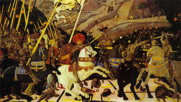 作者:保羅·烏切洛;倫敦,英國(guó)國(guó)家美術(shù)館;作品時(shí)間:約1450年 保羅·烏切洛是15世紀(jì)惠大利最具魅力的畫家之一,他一生致力于透視畫法的研究,《圣羅馬諾之戰(zhàn)》是他晚年為了紀(jì)念1432年佛羅倫薩戰(zhàn)勝錫耶納之戰(zhàn)而創(chuàng)作的杰出作品。該繪畫可能是科西莫·迪·美第奇為了裝飾美第奇宮殿而向畫家訂購(gòu)的,我們看到這幅是三幅描繪同樣戰(zhàn)斗場(chǎng)面繪畫中的一幅。畫面中央騎白色戰(zhàn)馬的是佛羅倫薩軍隊(duì)的司令官,是科西莫的朋友、支持者尼克羅·達(dá)·特倫提諾。 畫家通過精確巧妙的構(gòu)思,將觀賞者的視線吸引到尼克羅身上。通過馬匹色調(diào)的對(duì)比和長(zhǎng)矛所構(gòu)成的斜線指向突出了尼克羅的重要性。透視法展現(xiàn)出的如同舞臺(tái)一樣的空間,其背后的樹叢和風(fēng)景如同舞臺(tái)上的彩畫幕布。畫面從前景的三匹躍起的戰(zhàn)馬到中間的騎士混戰(zhàn)向遠(yuǎn)處陡坡上兩名騎士的背影延展開去。 畫面中的馬,鼻孔張開雙眼睜大。這種嘶嗚驚恐的樣子一定來自于畫家的觀察,但卻給人術(shù)制的感覺,似乎不是血肉之軀,簡(jiǎn)直就是童話中的木偶馬,這種高度格式化的馬形象在繪畫語言中前無來者。烏切洛用充滿游戲情趣的透視法,與騎士胯下的猶如木馬般的戰(zhàn)馬來調(diào)和畫面里洋溢的非現(xiàn)實(shí)性的氣氛,既真實(shí),又充滿虛幻,這當(dāng)然是繪畫大師的獨(dú)具匠心。 在那遙遠(yuǎn)的冷兵器時(shí)代,馬作為戰(zhàn)爭(zhēng)的工具,同主人一樣沖鋒陷陣,經(jīng)歷血雨腥風(fēng),面對(duì)冰冷的長(zhǎng)槍鐵錨,聽著震耳的喊殺聲,馬的無畏和勇敢來自于它的本性,它的精神,它與主人榮辱與共的結(jié)盟。當(dāng)我們?cè)趲装倌旰蟮慕裉煨蕾p大師的《圣羅馬諾之戰(zhàn)》時(shí),只知道坐在馬背上的將軍的名字,卻不知道那匹馬的名字,這也許就是馬對(duì)人類的高貴奉獻(xiàn)所在吧! |