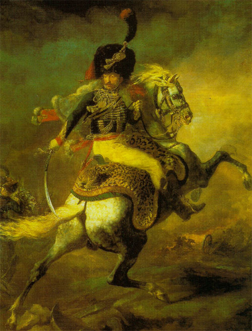 泰奧多爾·席里柯,生于18世紀末19世紀初期,法國浪漫主義天才。他悲劇性的人生既短暫又充滿波折,自幼崇拜馴馬演員,一生與馬緊密相連,畫馬的作品達千幅,年僅33歲卻不幸墜馬身亡。 這幅《輕騎兵軍官》是席里柯早期的成名作,是他在1812年入選沙龍并榮立金獎時的一幅作品,描繪的是一位揮刀馳騁的騎兵軍官躍馬戰(zhàn)場的場景。據(jù)說,畫家是看到后腿直立,前腿躍起的軍馬得到這幅畫的靈感。 在欣賞這幅作品時,首先我們要了解當時的歷史背景。那時法國處在一個動蕩不安的時期,拿破侖發(fā)動的戰(zhàn)爭給人們的生活帶來了巨大變化,并暫時取得了空前的勝利。從騎士騎坐的馬鞍我們就可以看出,豹紋的馬鞍傳達著異國風情的要素,這暗示著拿破侖的勝利已擴大到歐洲大陸以外的地區(qū)。再看馬鐙,青色戰(zhàn)馬狂暴地以后腿站立,騎兵松緩韁繩,腳卻牢牢地蹬住馬鐙,輕松地控制著馬,使人感到人馬合一的最高境界,也暗示著戰(zhàn)爭的空前勝利給人們帶來的歡欣鼓舞。畫面遠處的大炮殘骸則強調(diào)了這次沖鋒的激烈和敵人前線已被突破的狀況。面對騎兵的沖鋒,四散奔逃的敵軍發(fā)瘋似的穿過火墻逃亡遠處。畫家在這幅作品中,著力渲染動蕩緊張的氣氛,借助富于張力的躍馬動作、強烈的光影對比、生動的造型、特寫式的拉近場景,使觀眾親臨其境似的感受到硝煙滾滾戰(zhàn)馬嘶嗚的戰(zhàn)場廝殺之中。 從人類躍上馬背,馬從來就不是戰(zhàn)爭的旁觀者,馬的動力驅(qū)動著歷史的車輪滾滾向前。相對軍官,畫面中的青色公馬的撼烈無畏更讓人記憶深刻。 |