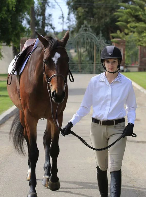 地面訓(xùn)練是每一位馬術(shù)運動員都應(yīng)該使用的方法。該方法是加強騎手與其馬的聯(lián)系以及確立自己威信的關(guān)鍵。本篇文章是五個好用而基礎(chǔ)的地面訓(xùn)練第二篇,講述如何正確牽馬。 訓(xùn)練正確牽馬 這個訓(xùn)練的目的是讓馬專注于你,專注于你的肢體語言。馬很容易走神,這一點你可以通過它們拉著你去看別的事物,或者想要超越你的行為看出。慢吞吞地在你后面的懶馬也不可能關(guān)注你,它們更關(guān)注于如何不跟上你的步伐。 本圖為前側(cè)方拍照,且示范人并不很準確 當(dāng)帶領(lǐng)一匹馬時,正確姿勢是讓馬的鼻子與手臂平行。既不在它前面,也不在它后面。查看馬是否領(lǐng)先于你的好方法是,拿起長鞭,并將長鞭水平放在身前,確保長鞭橫放在手臂上,一直延伸到馬的前腿。如果馬總是用鼻子撞長鞭,或者跑過這條鞭子的線,那么就是它們試圖走在前面了。我們的目標是讓馬走在后面。 如果是正確的牽引,馬會自覺停在騎手身邊,不需要拖拽,如果騎手加快步伐,它們也會自覺跟上,如果騎手停下來,馬也會停下來。 方法 要進行這個練習(xí),需要將馬匹帶著走一圈。騎手需要兩手放在調(diào)教索,一只手比另一只手更靠近馬的咽喉革,同時較遠的那只手握住長鞭,長鞭應(yīng)該在騎手身后,與馬的身體平行。 長鞭只用于警示懶馬,當(dāng)它們不想移動時,不要用長鞭打它們。如果它們還是很固執(zhí),用長鞭擊打地面,要求它們加速。 當(dāng)然這取決于你的馬是一匹精力充沛的馬,還是一匹懶馬。精力充沛的馬喜歡拉它們的騎手,這個時候,每當(dāng)它們越過手臂,騎手要停下來搖晃牽引繩。這是求它們后退,如果它們沒有響應(yīng),施加壓力。一旦按照騎手的要求做了,也要適當(dāng)獎勵馬匹。 如果是懶馬,也可以多進行步伐的快慢變化,當(dāng)騎手加快步伐時,它們也應(yīng)該加快步伐,如果它們不這樣做,用鞭子抽打地面要求它們前進。這樣的變化能讓它們專注于騎手的要求。最后,如果馬匹能做到不施加壓力,而跟著你的步伐加快或減慢速度,就可以給它們一些獎勵了。 這個訓(xùn)練不僅可以讓馬專注于你,而且還會建立馬對騎手個人空間的尊重。如果超越到騎手身前,那它就是不尊重你。它們學(xué)會跟在你畫的那條線后面,是它們尊重你是領(lǐng)導(dǎo)者的表現(xiàn)。同時,這個訓(xùn)練也教會了馬對騎手肢體語言做出反應(yīng),當(dāng)你減速時,它要減速;你加速時,它也要加速。 |