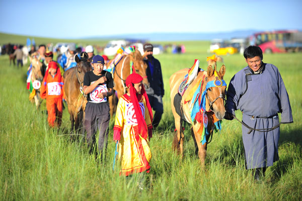 黑馬指的是黑色的馬,同時在體育報道中指的是爆冷門取得好成績的人或馬。阿布嘎黑馬是指一個馬品種,是生長在錫盟阿布嘎草原上黑色的馬,阿布嘎女子黑馬連在60年代曾受到過周恩來總理的高度贊揚.在這次大賽馬中,來自阿布嘎的馬成為了比賽中的“黑馬”,顛覆了整個內(nèi)蒙古草原。 盛夏時節(jié),初入草原,便感受到了“天似穹廬,籠罩四野”的大景象,覺得這首歌謠說的純粹是天和地的關系,這和人是沒有關系的,人到草原,就像一滴水融入大海,人太渺小了。 我們驅車奔馳在遼闊的錫林郭勒盟大草原上,目的地是西烏珠穆沁旗的政府所在地巴拉嘠爾高勒鎮(zhèn),那里將舉辦一年一度的傳統(tǒng)草原大賽馬(30.5公里耐力賽)。我們電視團隊五人小分隊,先行進入草原,采訪即將參加比賽的各地馬主、選手。我坐在前排副駕的位置上,視野相對開闊,無際的草原上幾百公里幾乎沒有參照物,我有時會感覺是坐在一種模擬的駕駛艙中,原地不動,草原從兩邊劃過。我想,在這樣遙遠無邊的空間里,人是無法靠兩腳去走的。偉大的自然賜予了人一種相互聯(lián)系的精靈,那就是馬。在草原上,馬雖然軀體和人一樣渺小,但馬有速度,馬的速度縮小了草原的空間,打破了草原的局限性,人便真正擁有了草原。 錫林郭勒是漢語音譯,意思就是美麗的河,我們在錫林河畔采訪馬術俱樂部的江樹軍先生,采訪調馬師巴特,因為江先生和巴特老師連夜去草原接小騎手迷了路,誤了點,我們是起了個大早,卻干了個晚集。早晨7點多鐘的時候,太陽的光芒很強烈,有內(nèi)地中午11點鐘的感覺。在監(jiān)視器上看,馬背上鑲嵌了一層刺眼的藍光,我忽然覺得有點莊周夢蝶的味道。雖然腳上的皮鞋都被露草濕透了,可采到了江先生,巴特老師的真言也值得。他們說:蒙古馬和其它混血馬的區(qū)別是,蒙古馬耐力好,中、短距離速度稍慢于其它改良馬。我們問那為啥還選擇蒙古馬參賽,他們說蒙古馬是蒙古族文化的一部分,蒙古馬長久奔跑的耐力好,越長距離就越顯優(yōu)勢,再說也是蒙族人精神的象征。蒙古馬在草原的生存能力極強,當草原變成茫茫雪原時,懷著身孕的蒙古馬,領著小馬駒,刨開積雪吃枯草養(yǎng)育后代。帶著蒙古馬去參加比賽,就是為了傳承這種文化,名利倒在其次,但也絕對差不了。 西烏珠穆沁旗簡稱西烏旗,“烏珠穆沁”意思是“摘葡萄者”,他們是從長葡萄的新疆那邊來的。這里的草原是世界四大草原之一錫林郭勒草原的典型區(qū)域和蒙古馬的核心區(qū),風光旖旎,蒙古族文化習俗保存的十分完整。我們趕到鎮(zhèn)里,看到不少人傳蒙古袍,街道很多馬匹穿來穿去。 在30.5公里的賽道上布置了25個固定機位。我們是雨中進入草原賽道的,今年雨水足,草原水草豐茂。有的地方的草快長到人的腰部,草原因為有草皮覆蓋,沒有水土流失,所以很少溝坎,但草原并不是平坦的,有山包,有坡地,就像大海一樣,遠看平展,近看波濤起伏。 2010年7月17日凌晨4點鐘,我們和大部隊趕到賽道起點,這里在小鎮(zhèn)的西南方向,在特別遼闊的成吉思汗瞭望山下,賽道基本為東南方向,臨近終點時向主會場沖刺。馬主門昨夜已開上輕型卡車在這里夜宿。太陽升的很快,草地上濕漉漉的,夜里露水很重,我很高興,希望馬奔跑時減少塵土。草原上有名的馬主、調馬師們,象呼倫貝爾的芒來(首屆冠軍),通遼市的松林(近兩屆冠軍),二連浩特的包昌(蒙古國賽馬冠軍)等在參賽馬中走來走去,裝作不經(jīng)意的樣子,可眼光又在馬身上飄來飄去,他們在看對手馬的狀態(tài),好馬能不能跑好,關鍵在昨天夜里,比如夜草吃的合不合適。這就是兵法上說的知己知彼,百戰(zhàn)不殆。西烏旗連續(xù)舉辦了好幾屆賽馬,只是上屆才得上名次,這次渴望更上一層樓,參賽的蒙古馬調的不錯,毛色發(fā)亮,肌肉發(fā)達,胸肋突出無贅肉,還找了個老騎手,小矮人。通遼市的馬主松林是近年的冠軍得主,他的馬是半血馬,已經(jīng)連續(xù)兩屆了,這次再奪冠就是三連冠了,不過他去年的冠軍馬,已轉手賣給了他人,也報名參加了今天的比賽,只是到現(xiàn)在馬上就要比賽了還不見冠軍馬的蹤影。松林預測今年報名馬雖少但好馬多于往年,比賽會更加激烈。 在賽道起點的排列中,有一位中年女選手引起了我們的注意,采訪中她笑著說,要是拿了冠軍,就再買匹馬。來自西烏旗的扎寶力格說,昨天黃昏時分,他們還穿上民族服裝,為賽馬舉行了香薰儀式,祈求好的成績,保佑騎手和馬兒的平安。 太陽從一個山包后升起,陽光充滿力量的照射在草原上,無際的青草更加滴翠。70多匹賽馬一字排開,上一屆的冠軍馬還是沒有來。 發(fā)令槍響!1號馬率先沖出,馬群隨后跟上,往東南方向飛馳而去。小飛機俯沖航拍,驚了一匹馬,選手從馬背上掉下來,剛才有決心奪冠的女選手,剛跑了一公里,就掉隊了。我坐上導演車,也向終點追去,路上看到了沒有騎手的馬,依然頑強的向前跑著。比賽開始,速度達到每小時50公里左右,轉眼就拉開了一條線,五公里處已分出三個集團。 有幾匹來自阿旗的純蒙古馬和眾多半血馬混在一起,樣子雖不如其它馬好看,但跑起來卻十分輕松。 我的車在賽道上,一會兒顛入小山谷,一會兒從天際線上爬坡、下坡,一會兒走S形道路,一會兒直線行駛在廣闊的草地上,我們在車內(nèi)體會著騎手的感覺。等我們趕到終點時,前十名的馬匹已沖過終點