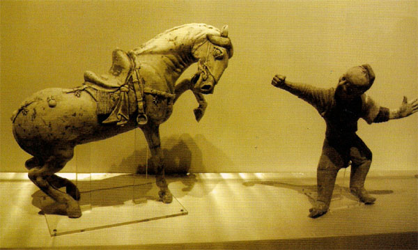 隨著人類社會(huì)的發(fā)展,馬的用途發(fā)生了巨大的變化。驍勇善戰(zhàn)的戰(zhàn)馬、鞠躬盡瘁的驛馬,這些都曾是馬兒大展才華的“崗位”。可如今我們?cè)僖部床坏饺笋R共戰(zhàn)、飛馬傳書的壯觀場(chǎng)面了。多數(shù)情況下,我們只能在賽馬場(chǎng)上一睹馬兒的風(fēng)采。然而還有一個(gè)并非廣為人知的“崗位”,它便是進(jìn)行舞蹈藝術(shù)的馬--舞馬。 現(xiàn)在奧運(yùn)會(huì)上的馬術(shù)表演被認(rèn)為是西方貴族的運(yùn)動(dòng),其中的盛妝舞步表演更是吸引了眾多的觀看者。那些經(jīng)過(guò)精心挑選和訓(xùn)練的馬在各種節(jié)拍的指揮下,展示各種優(yōu)雅的舞姿,給人一種高雅的享受。其實(shí)在中國(guó)古代就早已有了舞馬表演,而且其難度遠(yuǎn)遠(yuǎn)超過(guò)現(xiàn)在的盛裝舞步。 自先秦時(shí)代趙武靈王胡服騎射后,騎術(shù)得到了很大的發(fā)展,不僅應(yīng)用于軍事訓(xùn)練、作戰(zhàn),也作為雜技演出供人娛樂(lè)。盡管中原地區(qū)不是馬舞藝術(shù)的發(fā)源地,其馬舞活動(dòng)的產(chǎn)生也相對(duì)較晚,但是馬舞藝術(shù)卻在此發(fā)揚(yáng)光大。據(jù)史籍記載,早在魏晉南北朝時(shí)期,劉宋大明元年時(shí)就有“河南獻(xiàn)舞馬”,而且可能在更早的三國(guó)時(shí)期,曹植就曾訓(xùn)練舞馬。到唐代馬舞達(dá)到了一個(gè)空前的高峰,唐玄宗時(shí)期舞馬最多的時(shí)候曾達(dá)到四百匹。這些舞馬大多是來(lái)自塞外的貢馬,中原王朝引進(jìn)了馬舞活動(dòng)及其調(diào)教技術(shù),然后憑借自身發(fā)達(dá)的社會(huì)文明(其中舞蹈音樂(lè)藝術(shù)應(yīng)是主要的因素)將其不斷提高,最終創(chuàng)造出一種成熟而絢麗的馬舞藝術(shù)。 飲酒賦詩(shī),喜歌好舞,是唐代人的一種精神面貌,唐玄宗就是一位能歌善舞的皇帝,在位期間非常喜歡舉行各種盛大的文藝演出。唐玄宗把他的生日八月初五定為“千秋節(jié)”,每逢此節(jié)便舉行盛大的慶賀宴會(huì)并進(jìn)行樂(lè)舞表演;場(chǎng)面宏偉,壓軸大戲就是馬舞表演。 這些舞馬分為左右兩部,各有其名,如“某家寵”、“某家嬌”等。每次表演之前,要為其披上錦繡,系上金鈴,在其鬃毛間綴上明珠,并挑選年少俊美的樂(lè)工數(shù)人,著淡黃衣衫,系文玉腰帶,為馬舞表演伴奏樂(lè)曲。 表演時(shí),這些舞馬隨著《傾杯樂(lè)》樂(lè)曲的節(jié)拍旋律起舞,昂首揚(yáng)尾,縱橫往來(lái),作各種舞姿,氣勢(shì)奪人,真可謂妙不可言。除群馬共舞外,還有單匹獨(dú)舞。有時(shí)安設(shè)三層板床,馭手乘馬而上,馬在上面旋轉(zhuǎn)如飛。有時(shí)又由一大力士舉一榻,馬于榻上伴樂(lè)而舞。 如此氣勢(shì)恢弘的場(chǎng)面,看上去既有趣又氣派,但僅僅是這些似乎又缺少了什么。于是有御用文人站出來(lái),從中提煉出些崇高神圣的主題--百獸來(lái)舞,共賀天子圣明,萬(wàn)代升平,這便成為整個(gè)舞馬節(jié)目的高潮。唐代宰相張悅就曾為《傾杯曲》做了六首舞馬詞作為歌詞為唐玄宗敬酒祝壽,“彩旄八佾成行,時(shí)龍五色因方。屈膝銜杯赴節(jié),傾心獻(xiàn)壽無(wú)疆?!贝祟愇桉R詩(shī)極盡頌揚(yáng)歌拜之能事,雖然有些夸張,卻有許多精到的描寫,舞馬便憑借這些詩(shī)文名留史冊(cè)。 “或進(jìn)寸而退尺,時(shí)左之而右之……知執(zhí)轡之有節(jié),乃蹀足而爭(zhēng)先。隨曲變而貌無(wú)停趣,因矜顧而態(tài)有遺妍。既習(xí)之于規(guī)矩,或奉之以周旋。迫而觀焉,若桃花動(dòng)而順吹,遠(yuǎn)而察之,類電影倏而橫天……” “連騫勢(shì)出魚龍變,躞蹀驕生鳥獸行?!蔽桉R魚貫入場(chǎng),小步頻邁,步態(tài)輕巧。 “腕足齊行拜兩膝,繁驕不進(jìn)踏千蹄……更有銜杯終宴曲,垂頭掉尾醉如泥。”腕足齊行,兩膝作跪拜狀,和著樂(lè)曲踏蹄行進(jìn),當(dāng)曲終之時(shí)口銜酒杯,垂頭掉尾仿佛酣醉般。當(dāng)馬舞數(shù)十回合后,為了表示對(duì)唐玄宗生日的祝賀,就“腕足齊行拜兩膝”,為唐玄宗上壽。玄宗非常高興,就令內(nèi)侍賜給馬一杯酒,馬自銜自飲,飲畢后就做出“垂頭掉尾醉如泥”的表演。僅觀其“蹲踞翻卷、頓纓驤首、腕足膝行、踏步徘徊、揚(yáng)鬃跳躍、進(jìn)退側(cè)轉(zhuǎn)…”就足以讓我們眼花繚亂。但是這些為眾人帶來(lái)歡樂(lè)的舞馬的結(jié)局卻是十分悲慘。 安史之亂中,唐玄宗倉(cāng)皇逃往蜀地,養(yǎng)在宮苑里的舞馬大多散落到民間。安祿山曾在皇宮里見識(shí)過(guò)這些舞馬的舞姿,便派人將剩下的幾十匹舞馬聚攏起來(lái),送回范陽(yáng)。后來(lái)這批馬為田承嗣所得,田承嗣為安祿山的部將,為人殘暴奸詐,他不知道它們的來(lái)歷,只把它們當(dāng)成普通的戰(zhàn)馬來(lái)使用。有天軍中有人奏樂(lè),那些舞馬聽見熟悉的樂(lè)音,立刻像從前一樣踏樂(lè)而舞,養(yǎng)馬的兵士們以為這些馬是中了邪魔,便揮舞棍棒上前一陣亂打,但因?yàn)橐魳?lè)聲沒(méi)有停止,所以馬繼續(xù)舞蹈。兵士們害怕了,趕快跑去報(bào)告田承嗣。 田承嗣自己也沒(méi)見過(guò)舞馬,以為這是妖異之象,就下令狠狠地打它們??蓢@這些優(yōu)雅乖巧的舞馬無(wú)法揣測(cè)暴徒們的心思,以為主人嫌它們跳得不好,棍棒之下反而跳得更加賣力,始終不敢停歇下來(lái),直到最后都被