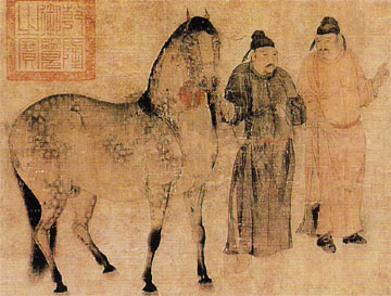 素有詩仙之稱的唐朝詩人李白,其《將進(jìn)酒》廣為傳誦,但對(duì)“五花馬,千金裘,呼兒將出換美酒”這一詩句中的“五花馬”的解釋一直是模棱兩可。一說五花馬是毛色呈五花紋的馬,一說像三花馬修剪馬鬣為三瓣一樣,五花馬是修剪馬鬣為五瓣的馬。這些解釋直接影響著人們對(duì)此詩的誦習(xí),因此非常有必要對(duì)此作一番考證。先從三花馬說起。宋人郭若虛《圖畫見聞志·卷五》“三花馬”條下云:“唐開元天寶之間,承平日久,世尚輕肥,三花飾馬。舊有家藏韓干畫《貴戚閱馬圖》中有三花馬,兼曾見蘇大參家有韓干畫《三花御馬》,晏元獻(xiàn)家張萱畫《虢國出行圖》中有三花馬。三花者,剪騣為三瓣。白樂天詩云:‘鳳箋書五色,馬鬣剪三花?!?韓干是唐天寶間宮廷畫馬名師,其《貴戚閱馬圖》和《三花御馬》今已不存?!缎彤嬜V·畜獸一》記載有“寫三花御馬圖”,《南宋館閣續(xù)錄·卷三》也記載有“三花御馬圖”,可知《三花御馬》圖確有其物。韓干畫過許多三花馬,這從宋朝詩人對(duì)韓干畫作的描述中可以看出。樓鑰的《題高麗行看子》中有“竹批雙耳風(fēng)入蹄,霜鬣剪作三花齊?!薄对兕}行看子》中有“三花剪鬣自官樣,空鞍更以香羅幪。”在第一首前有小序曰:“高麗賈人有以韓干馬十二匹質(zhì)于鄉(xiāng)人者,題曰:行看子,接赴黃綾,上書‘韓干馬’……”朱翌的《韓干二馬圖》中有“剪成三鬃代官字,濯之太液登王閑?!边@三首詩都是針對(duì)韓干的圖畫所題,在唐朝三花飾馬曾風(fēng)靡一時(shí),從前引詩句和《貴戚閱馬圖》、《三花御馬》等圖畫的名稱中可以看出三花飾馬是當(dāng)時(shí)宮廷的時(shí)尚,皇族貴戚都喜乘有三花裝飾的馬匹。但是如何修剪裝飾呢?可以從實(shí)物中得到確證。唐朝的另一畫師張萱的《虢國夫人游春圖》的宋摹本藏在今遼寧省博物館,這幅畫的名稱雖然和郭若虛記載的《虢國出行圖》不同,但在《宣和畫譜·人物一》中有著錄,“今御府所藏四十有七:虢國夫人夜游圖一,虢國夫人游春圖一,虢國夫人踏春圖一?!贝藞D中也有三花馬,其頸上鬃鬣修剪成三瓣,如連綿起伏的三座山峰。顯而易見,唐人是以此提高馬的觀賞價(jià)值,使馬看起來更俊美。這一風(fēng)俗還被當(dāng)時(shí)的詩人所吟詠。岑參的《赤驃馬歌》中有“紫髯胡雛金剪刀,平明剪出三騣高”句,白居易《和春深二十首·其六》中有“鳳書裁五色,馬鬣剪三花”句,從中可以更確切地知道三花是用剪刀修成。與此同時(shí),三花另有他說?!缎绿茣俟僦尽吩疲骸胺餐饽翚q進(jìn)良馬,印以三花 ‘飛’ 、‘鳳’之字?!薄短屏洹吩疲骸胺餐饽吝M(jìn)良馬印以三花、飛、風(fēng)之字,而為志焉。” 李林甫等注曰:“細(xì)馬次馬送尚乘局者于尾側(cè)依左右閑印以三花,其余雜馬送尚乘者以風(fēng)字印印右髆,以飛字印印左髆。”細(xì)馬和次馬皆是良馬中的上品,尚乘局是負(fù)責(zé)掌管御用馬匹的專門機(jī)構(gòu),三花圖案是上等駿馬成為御馬的標(biāo)志,直接加印在馬的尾側(cè)。這與修剪而成的三花馬截然不同,前引圖畫和詩句所述是前者。 唐代是否有五花飾馬的習(xí)俗呢?《佩文韻府·卷一》“五騣”條引《畫斷》云:“唐人尚剪騣,馬三騣者曰三花,五騣者曰五花?!?《畫斷》是唐人張懷瓘所作,但《新唐書·藝文志》中僅著錄其作《書斷》三卷,《評(píng)書藥石論》一卷,無《畫斷》,今僅存輯自《歷代名畫記》中的片斷,其中無此語,所以此條的真實(shí)性尚待考證不宜為證。由三花飾馬推斷五花飾馬的存在也無其他有力的物證和文字材料。而唐人朱景玄《唐朝名畫錄》中記載:“ 開元后四海清平,外國名馬重譯累至,然而沙磧之遙,蹄甲皆薄。明皇遂擇其良者與中國之駿馬同頒,盡寫之。自后內(nèi)廄有飛黃、照夜、浮云、五花之乘,奇毛異狀……”(《宣和畫譜·畜獸一》和《太平廣記·卷二百十一》皆作“五方”,似誤,應(yīng)作五花)因與中國駿馬雜交,故有諸多特異品種,“五花”為其中之一。五花馬乃是上乘駿馬的名稱。以五花命名,是因?yàn)榇朔N馬的毛皮有五種顏色,而五色是寶馬的標(biāo)志之一。這種相馬的標(biāo)準(zhǔn)早在唐以前就存在了。《漢書·西域傳》云:“宛別邑七十余城,多善馬。馬汗血,言其先天馬子也?!泵峡底⒃唬骸把源笸饑懈呱?,其上有馬不可得,因取五色母馬置其下與集,生駒,皆汗血,因號(hào)曰天馬子云?!睘榕c大宛善馬匹配而特取五色馬,說明五色馬已是當(dāng)時(shí)的駿馬?!稌x書·載記·苻堅(jiān)傳上》云:“大宛獻(xiàn)天馬千里駒,皆汗血、朱鬣、五色、鳳膺、麟身,及諸珍異五百余種。”此時(shí)毛之五色已明確作為天馬千里駒的標(biāo)準(zhǔn)之一。杜甫《高都護(hù)驄馬行》有“五花散作云滿身,萬里方看汗流血”句,對(duì)五花馬的毛色做了形象的比喻,凸現(xiàn)了這種駿馬的飄逸之態(tài)。唐人蘇鶚《杜陽雜編》中有“上(代宗)因命御馬九花虬并紫玉鞭轡以賜子儀……九花虬,即范陽節(jié)度使李德山所貢,額高九寸,毛拳如麟,頭頸鬃鬣真虬龍也,每一嘶則群馬聳耳,以身披九花紋故號(hào)為九花虬?!本呕耙嘁蚱涿y而為名馬,同時(shí)也說明,唐朝有以花色為馬命名的習(xí)俗。五花馬自唐以后則逐漸成為寶馬的代名詞,被后世詩人爭相引用,同時(shí)又有“五花驄”、“五花驕”等別