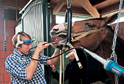 特別鳴謝筆者的兩位牙醫(yī)朋友,感謝他們?yōu)楸疚淖鲱檰枺?/i> 荷蘭牙科馬獸醫(yī) Christie 女士 比利時牙科馬獸醫(yī) Stijn 先生 作者:彭煜師 馬獸醫(yī) 中國農(nóng)業(yè)大學(xué) 動物醫(yī)學(xué)臨床碩士 前往比利時接受培訓(xùn)后,與比利時馬匹肢蹄病專家 Sigert、繁育專家 Celine 組成樂馳馬醫(yī)療獸醫(yī)團(tuán)隊 Q: 醫(yī)生,為什么我的馬需要挫牙? A: 首先,馬作為草食動物,在進(jìn)食時需要長時間的進(jìn)行咀嚼,經(jīng)過精細(xì)研磨的草料進(jìn)入胃腸道后,營養(yǎng)才能夠被充分吸收。如果馬的牙齒不好就會導(dǎo)致咀嚼不完全,沒有經(jīng)過充分研磨的草料就不能被充分消化吸收,這樣就會導(dǎo)致嚴(yán)重的后果,如馬匹營養(yǎng)不良、結(jié)癥以及腹痛。 另外,我們咀嚼的時候牙齒是“嘎吱”“嘎吱”的上下運(yùn)動,而馬兒的臼齒在咀嚼的時候是水平運(yùn)動,像個研磨機(jī)一樣把草料給慢慢磨碎。馬的上頜是要寬于下頜的。生長結(jié)構(gòu)和咀嚼運(yùn)動的特殊性使得馬匹上頜的臼齒外側(cè)緣比內(nèi)側(cè)緣要長且鋒利,很容易就會傷到口腔。而下頜的臼齒則相反,內(nèi)側(cè)緣會更長更尖,容易傷到舌頭。 通過定期的口腔檢查和挫牙,獸醫(yī)會將馬的臼齒打磨平整,這樣既能保護(hù)馬兒的口腔和舌頭,又能保證馬的咀嚼能力。 Q:挫牙的時候馬兒疼不疼??? A:馬的牙齒表面沒有任何神經(jīng),所以當(dāng)醫(yī)生們“吭哧吭哧”地給馬兒挫牙的時候,雖然你看著很疼,但馬兒實(shí)際上是不疼的。 Q:挫牙會對我的馬造成傷害嗎? A:當(dāng)馬匹配合牙醫(yī)的操作時,是不會對馬造成傷害的。偶爾會碰到黏膜有少量出血的時候,用生理鹽水沖洗即可。但如果馬兒不配合,那我們就要用到鎮(zhèn)靜藥了,讓它在迷迷糊糊中完成挫牙,以免傷到自己。個別馬匹在挫完牙后可能會不適應(yīng),會出現(xiàn)兩三天飯量減少的情況,注意觀察,在它適應(yīng)后就會恢復(fù)正常食量。 這匹馬由于上下頜臼齒不對齊,突出的前臼齒和臼齒長得很長,已經(jīng)損傷口腔造成潰瘍了。 Q:但是我不想我的馬兒用鎮(zhèn)靜藥,怕對它身體不好。 A:要想進(jìn)行徹底的口腔檢查和治療,使用鎮(zhèn)靜藥是很必要的,是避免對馬兒造成傷害最好的方法。只要馬匹身體健康,合理使用鎮(zhèn)靜藥并不會對它產(chǎn)生傷害。當(dāng)然,對于年老體弱的馬匹,獸醫(yī)會調(diào)整鎮(zhèn)靜藥的使用方案,盡量減少鎮(zhèn)靜藥帶來的風(fēng)險。 Q:我的馬還小,才 3 歲,幾歲給它挫牙合適呢 ? A:決定馬匹需不需要挫牙的不是年齡,而是它牙齒的情況。即使是兩三歲的馬,也有可能有很多牙齒問題。草料的比例、干草的質(zhì)量、馬匹的個體差異和它們的行為習(xí)慣都會影響到馬牙齒的狀況。所以,每年至少一次的獸醫(yī)口腔檢查是很有必要的。獸醫(yī)會根據(jù)馬匹牙齒的情況建議其是否需要立即挫牙,以及多久挫一次比較合適。 馬匹的牙齒隨著年齡的變化會呈現(xiàn)出不同的特點(diǎn)。有個成語叫“馬齒徒增”,大家可以試試看能不能根據(jù)馬牙齒的數(shù)量看出馬兒的歲數(shù)。但事實(shí)上,由于每匹馬都存在個體差異,根據(jù)牙齒的特征變化往往是不能準(zhǔn)確判斷馬匹年齡的。 Q:我聘請的獸醫(yī)怎么才給它挫了十五分鐘呢?怎么著也得挫個四十分鐘才夠本吧? A:在馬匹牙齒狀況非常不好、有很多需要修正的地方,而且獸醫(yī)使用的是手工挫牙工具時,的確可能要工作 40 分鐘甚至更久。但一般情況下,熟練的獸醫(yī)在十幾分鐘內(nèi)足以完成挫牙的任務(wù)。使用電動挫牙機(jī)會大大提高效率哦。 Q:到底用電動的挫牙機(jī)好還是手動挫牙好? A:這個問題前段時間曾引起過很大爭議。通過微信的宣傳,一些馬主深信電動挫牙對馬不好,堅持讓獸醫(yī)手動挫牙。很多獸醫(yī)也通過微信表達(dá)了反對這種說法的立場。那到底哪種方法更好?在這里,我很負(fù)責(zé)任的告訴你,電動挫牙并不比手動挫牙差。就像洗衣服是用機(jī)洗好還是手洗好?粽子咸的好吃還是甜的好吃?豆腐腦是吃帶鹵的爽還是加桂花蜜的香?類似這種問題,不同的人心中會有不同的答案。 挫牙也是一樣,國外挫牙師不允許使用鎮(zhèn)靜藥,他們往往更傾向于手動挫牙,因?yàn)槁曇舯入妱拥男?,馬更容易接受。而職業(yè)馬獸醫(yī)則更傾向于選擇電動挫牙,因?yàn)榭勺儞Q功率的電動挫牙機(jī)可以更徹底的修正馬的牙齒,特別是在挫靠后的臼齒時,留給手動挫牙工具來回移動的空間并不多,某些角度很難進(jìn)行徹底的修整。 不同地區(qū)的傳統(tǒng)也不一樣,來自南半球新西蘭和澳大利亞的挫牙師更傾向于選擇手動挫牙。而歐美的獸醫(yī)和挫牙師都喜歡用電動的。 Q:手動挫牙由于動作幅度大更容易損傷口腔黏膜還會有導(dǎo)致撕裂傷的可能? A: 只要挫牙師小心操作,很少會導(dǎo)致撕裂傷,而口腔黏膜的輕微損傷并不會導(dǎo)致嚴(yán)重的后果。 Q: 電動挫牙產(chǎn)熱快會損傷牙齒和牙齦? A: 挫牙機(jī)的轉(zhuǎn)速不夠快,不在同一部位停留過久,每隔幾分鐘將牙挫置于水中冷卻散熱,就完全可以避免這個傷害。 Q: 電動挫牙噪音會使馬厭惡挫牙? A:不喜歡挫牙的馬,不管是手動的還是電動的它都不喜歡。的確,電動挫牙的噪音會比較大,但習(xí)慣了電動