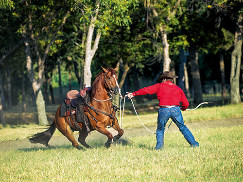 通常來說,馬在戶外會(huì)比在場地內(nèi)更興奮。這就是為什么很多時(shí)候場地里表現(xiàn)安靜的馬匹,在野騎中會(huì)特別興奮,不服從騎手的指令。馬匹興奮還可能是因?yàn)樵谏像R之前,騎手沒有給馬做足準(zhǔn)備活動(dòng),也就是打圈等。無論是什么原因,騎手都應(yīng)該讓馬匹知道聽從騎手的指令,不能隨意亂蹦,釋放能量。 對于馬匹在野騎時(shí)出現(xiàn)的不服從的情況,安德森從兩方面為騎手提供了解決方法:一是針對馬匹在野騎時(shí)表現(xiàn)出不尊重的情況,二是在場地內(nèi)對馬匹進(jìn)行服從性的調(diào)教。野騎訓(xùn)練時(shí),最好給馬匹佩戴輕銜鐵(snaffle bit),不要使用有頰桿的銜鐵。輕銜鐵只會(huì)給馬匹的嘴部帶來壓力,可以幫助馬匹更好地對騎手的指令做出反應(yīng)。 野騎中 如果野騎時(shí)馬匹出現(xiàn)反抗或不服從,盡量保持自己的心情冷靜,馬匹能感受到騎手的心情,如果騎手開始緊張,馬匹會(huì)更加緊張。不要嘗試通過向后拉雙韁來讓馬匹冷靜下來,因?yàn)轳R的力量一定比騎手的大,所以這不僅不起任何作用,并且會(huì)使得馬匹更加感到幽閉恐懼,從而加深恐懼。幽閉恐懼是指馬匹因恐懼本能地想要逃跑時(shí),被外力限制而不能逃跑所加深的恐懼。試想如果是你突然被獨(dú)自扔到大森林中,在聽到草叢沙沙作響想要逃跑時(shí)卻被死死地綁住不能動(dòng)彈,你會(huì)不會(huì)感到更加恐懼? 相反,一次只拉一根韁繩能大大幫助騎手和馬匹:這種拉單韁的“緊急剎車”可以讓馬匹的前肢轉(zhuǎn)動(dòng)進(jìn)入圈程,后肢交叉旋轉(zhuǎn),阻礙馬匹向前的動(dòng)力,讓馬匹稍稍失去平衡,從而無法撂蹄子、急沖或是急閃。 在拉單韁讓馬匹做小圈程停止之前,騎手的重心向后坐以免被向前彈飛,大腿貼住馬鞍幫助自己保持平衡,但同時(shí)小腿不要擠壓馬匹,以免給馬匹錯(cuò)誤的信號(hào)。手輕拉韁繩將馬頭拉向任意一個(gè)方向,馬頭觸碰騎手的腳。切記一定不要猛拉韁繩,這樣可能會(huì)使得馬匹失去平衡,有摔倒的風(fēng)險(xiǎn)。 當(dāng)馬匹進(jìn)入一個(gè)小的圈程,騎手可以重新收回對馬匹的控制。這時(shí),騎手可以將馬匹拉停,也可以繼續(xù)走小的圈程,多換方向,不斷給馬提示,和馬聯(lián)系讓馬集中注意力,直到馬匹變得服從。 隨后,需要進(jìn)一步練習(xí)幫助馬匹更好地集中注意力。可以圍著樹木灌叢做一些轉(zhuǎn)彎、八字、蛇形等等,任何你想做的練習(xí),讓馬匹去思考。訓(xùn)練直到馬匹完全服從、安靜下來。隨后可以繼續(xù)野騎。 如果馬匹出現(xiàn)后退或是猶豫,不要試圖通過催馬來讓馬向前走,再強(qiáng)調(diào)一遍,騎手無法從力量上勝過馬匹。這時(shí)還是應(yīng)該拉單韁,讓馬匹進(jìn)入一個(gè)小的圈程,開始活動(dòng)起來。 在任何時(shí)候,如果騎手感到不安全,無法控制住馬,就下馬做一些平地工作(在野騎時(shí)可以攜帶一個(gè)調(diào)教索。) 但在平地訓(xùn)練過程中不要讓馬匹靜止站立休息,這會(huì)讓馬匹認(rèn)為自己的煩躁不服從可以換來休息時(shí)間,而會(huì)繼續(xù)不服從。應(yīng)該讓馬匹不斷運(yùn)動(dòng),經(jīng)常變換方向,集中馬匹的注意力,直到看到馬匹放松的信號(hào)——低頭、舔舐嘴唇、大嘆氣等。隨后再上馬繼續(xù)野騎。如果馬匹每次不服從時(shí),騎手都立刻制止,馬匹會(huì)開始思考怎樣做是對的,怎樣才能讓自己減少很多工作。 場地內(nèi) 為了減少馬匹在野騎過程中不服從的次數(shù),應(yīng)該增加平時(shí)平地工作的量。平地工作是建立信任、尊重和服從的基礎(chǔ)。對于那些需要更加平靜、專注和服從的馬匹,平地工作更為重要。在馬群中,頭馬通過要求馬群向前、后、左、右移動(dòng)來確立自己的領(lǐng)導(dǎo)地位;在平地工作中,騎手也需要通過向前、后、左、右移動(dòng)馬匹來確立自己的地位。騎乘前的簡單平地工作,如打圈、頸部垂直和左右的曲撓,也可以幫助馬匹釋放一定能量。在下面,安德森將會(huì)給大家介紹兩個(gè)場地內(nèi)野騎訓(xùn)練的路線:“馬匹頸部的左右曲撓”和“學(xué)習(xí)服從停止的口令”。 頸部的左右曲撓 練習(xí)馬匹頸部的左右曲撓可以幫助馬匹更好地服從騎手腿部和韁繩的指令。馬嘴通常都很敏感,只是他們的身體很硬,通過練習(xí)左右的曲撓,可以幫助馬匹柔軟自己的身體,進(jìn)而柔軟他們的嘴,這能幫助騎手更好地控制馬匹。左右曲撓的練習(xí)也使得馬匹無法逃避或反抗騎手的指令。 第一步:向左曲撓。 要求馬匹左里懷走一個(gè)直徑3-4英尺(約0.9-1.2米)的圈程。拉單韁直到馬匹的頭部向左轉(zhuǎn)碰到騎手的左腳。慢慢縮短韁繩,將韁繩向自己臀部的方向拉,并用內(nèi)方腿輔助馬匹,讓馬匹彎曲自己的身體。 第二步:獎(jiǎng)勵(lì)馬匹的每次嘗試。 馬術(shù)不是騎手做了什么,而是騎手什么時(shí)候停下自己正在做的。當(dāng)馬匹達(dá)到騎手的要求后,即使只是給了一點(diǎn)點(diǎn)韁繩,也要立刻松開韁繩:騎手松開壓力的速度越快,馬匹理解得也就越快,學(xué)得也越快。保持耐心,在馬匹理解騎手前可能需要15-20分鐘的重復(fù)練習(xí)。 第三步:向右曲撓。 當(dāng)馬匹理解左側(cè)的動(dòng)作后,離開圈程,向前直線走大約15英尺(約5米),按上述步驟開始