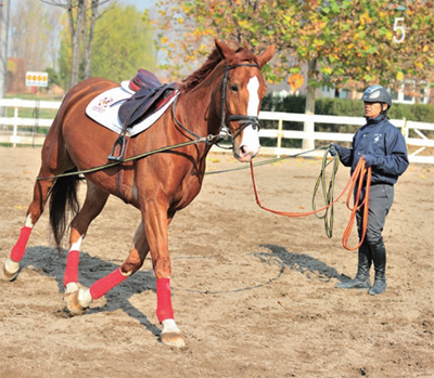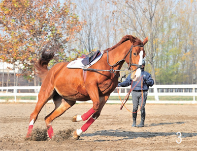 你的馬有時(shí)容易慌張不安嗎?本文將告訴你如何讓馬匹冷靜并勇敢起來(lái)。在調(diào)教易于緊張焦慮的馬匹時(shí),你需要仔細(xì)觀察它們的反應(yīng)。哪怕它們只是做出了一點(diǎn)點(diǎn)的努力和嘗試,請(qǐng)記得適時(shí)給予獎(jiǎng)勵(lì)。 走出“舒適區(qū)” 馬匹天性就懂得逃跑,它們的本能就是逃離它認(rèn)為危險(xiǎn)的事物,但是隨著日漸成熟,大多數(shù)經(jīng)過(guò)良好調(diào)教的馬匹可以學(xué)會(huì)如何去應(yīng)對(duì)生活中可能遇到的各種危險(xiǎn)。不過(guò),當(dāng)它們年輕或者缺乏經(jīng)驗(yàn)的時(shí)候,便會(huì)像本文中的這匹馬一樣,一旦受到驚嚇,就會(huì)做出過(guò)激的反應(yīng)。 這樣的馬匹容易無(wú)端地恐慌,反應(yīng)過(guò)于強(qiáng)烈,致使騎手在很多場(chǎng)合下措手不及,甚至從馬背上跌落,以至于不敢再騎上這匹“問(wèn)題馬”。其實(shí),人們很容易用自己的方式去解讀馬匹的行為。有些人甚至認(rèn)為這些馬是故意淘氣,它們的小把戲都是計(jì)劃好的。但事實(shí)遠(yuǎn)不是如此。 在馴馬師的眼里,大部分這樣的馬匹可能會(huì)帶來(lái)麻煩,但是它們并不可怕。有些馬會(huì)因?yàn)猷须s的噪音、突然移動(dòng)的物體或者是肢體的碰觸,而感到煩躁。人們應(yīng)該明白一點(diǎn):馬匹的任何舉動(dòng)都事出有因。馬匹只是想得到認(rèn)可,而我們的職責(zé)就是引導(dǎo)它們友好地與人類相互合作。 圖1中,馬主正在給馬匹做打圈練習(xí)。馬主或者騎手有時(shí)候太過(guò)于追求安全和平穩(wěn)。圖中打圈練習(xí)的動(dòng)作都很準(zhǔn)確,但是看看這匹馬,它好像只能一直持續(xù)做這一個(gè)動(dòng)作而已,是時(shí)候讓它走出“舒適區(qū)”了。 大膽嘗試 對(duì)于人類而言,走出“舒適區(qū)”去探索未知的領(lǐng)域能促使成長(zhǎng)和成熟,馬匹亦是如此。讓其接觸到新鮮事物,馬匹會(huì)變得愈加自信;而馴馬師要做的就是給予它們信心,幫助馬匹,讓其意識(shí)到自己潛在的能力。如果只是持續(xù)做同一件事,事情就不可能有進(jìn)展。 圖2中,馴馬師更換了一條更長(zhǎng)并且分量更重的調(diào)教索,這在隨后的長(zhǎng)韁打圈練習(xí)中有用。首先,將馬鞍兩側(cè)收起的腳鐙放下來(lái),以便讓馬匹感受到腳鐙的擺動(dòng);然后把韁繩在鞍頭相互交叉,在鞍尾固定,使其下垂的位置和騎手手部擺放的位置相類似。 改變與適應(yīng) 馴馬師再次給馬匹做打圈練習(xí),這次圈乘的半徑大一些,并且要求馬匹用“勇敢”些的快步去完成圈乘,但是這匹馬有些反應(yīng)過(guò)度(如圖3所示),它一下子就跑步?jīng)_了出去。這些改變都讓馬感到新奇,走出了原本的舒適區(qū),需要花一些時(shí)間適應(yīng),直到確認(rèn)這樣做不會(huì)受到傷害,它便會(huì)安靜下來(lái)并且服從。 一旦馬匹表現(xiàn)出了服從,馴馬師可以慢慢向它走過(guò)去,示意它停下來(lái),在做反方向圈乘之前拍拍它以示鼓勵(lì)。當(dāng)馴馬師接近的時(shí)候,馬匹可能會(huì)表現(xiàn)得十分機(jī)警,重復(fù)這樣做,它就會(huì)適應(yīng)并且放松下來(lái)。 泛洪法的作用 一些馴馬師采用泛洪法,這是一種迫使馬匹直面危險(xiǎn)和恐懼的方法。想象一下你害怕的東西,比如蜘蛛,現(xiàn)在想象你被鎖在了一間爬滿蜘蛛的房間里。這就是泛洪法,旨在逼迫自己經(jīng)歷極端的恐懼,在下次見(jiàn)到一只蜘蛛的時(shí)候,就可以輕松應(yīng)對(duì)了。 然而,本文中的馴馬師不會(huì)采取泛洪法,因?yàn)樗徽J(rèn)為這是一種訓(xùn)練馬匹的友好方式。每匹馬對(duì)泛洪法的反應(yīng)各不相同,它們或屈服讓步,或徹底被驚嚇到,這樣只能讓情況愈演愈糟。 持續(xù)連貫 訓(xùn)練馬匹就像是用紙牌搭金字塔一樣,你得小心翼翼地將每一張牌擺放到位,不能碰倒任何一張。記住這一點(diǎn),馴馬師就可以進(jìn)行下一個(gè)步驟了。 現(xiàn)在馬匹依然會(huì)因?yàn)轳Z馬師的接近而感到不自在,是時(shí)候再讓它接觸下其他新的嘗試了。如圖4在做快步圈乘的時(shí)候,不斷地把調(diào)教索扔到它的背上。當(dāng)調(diào)教索頭幾次落到馬背上的時(shí)候,馬會(huì)顯得慌張。但是幾次之后,當(dāng)明白這調(diào)教索不會(huì)構(gòu)成傷害,它就不再理會(huì)甚至不會(huì)察覺(jué)了。 馴馬師再次強(qiáng)調(diào)了不要迫使馬匹一次性過(guò)多地接觸新鮮事物。循序漸進(jìn)地教授它,一步一個(gè)腳印,注意仔細(xì)觀察它的反應(yīng)。如果感到自己的要求過(guò)于苛刻,就放慢速度,直到馬匹再次感到舒適再繼續(xù)。 長(zhǎng)韁打圈法 如圖5,馴馬師在馬匹口銜鐵的兩側(cè)各固定了兩條調(diào)教索,并將外側(cè)調(diào)教索繞到馬匹后肢的后面。有些馴馬師習(xí)慣把調(diào)教索直接栓到口銜鐵上,在騎馬的時(shí)候,韁繩也是要固定在銜鐵上的,所以在訓(xùn)練的時(shí)候,他們認(rèn)為沒(méi)有必要把調(diào)教索系到調(diào)教籠頭的鼻革上,但是這需要很高的技術(shù)要求,要保證調(diào)教索與馬嘴的正確接觸。 使用長(zhǎng)調(diào)教索的好處是可以讓馬匹無(wú)需停止就可以做雙方向的圈乘。雙手各執(zhí)一根調(diào)教索,讓馬匹先向某一方向運(yùn)動(dòng),當(dāng)它開(kāi)始前進(jìn)的