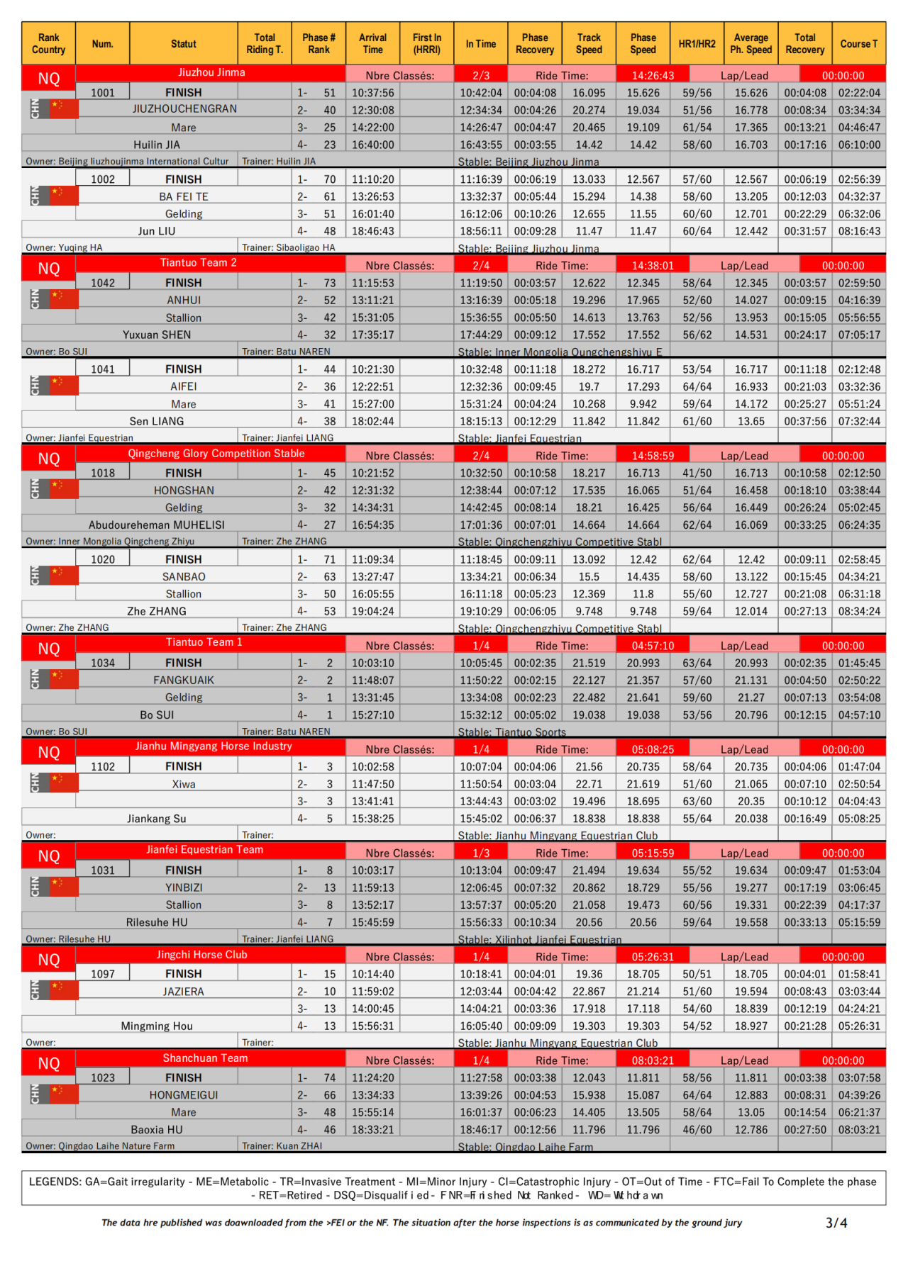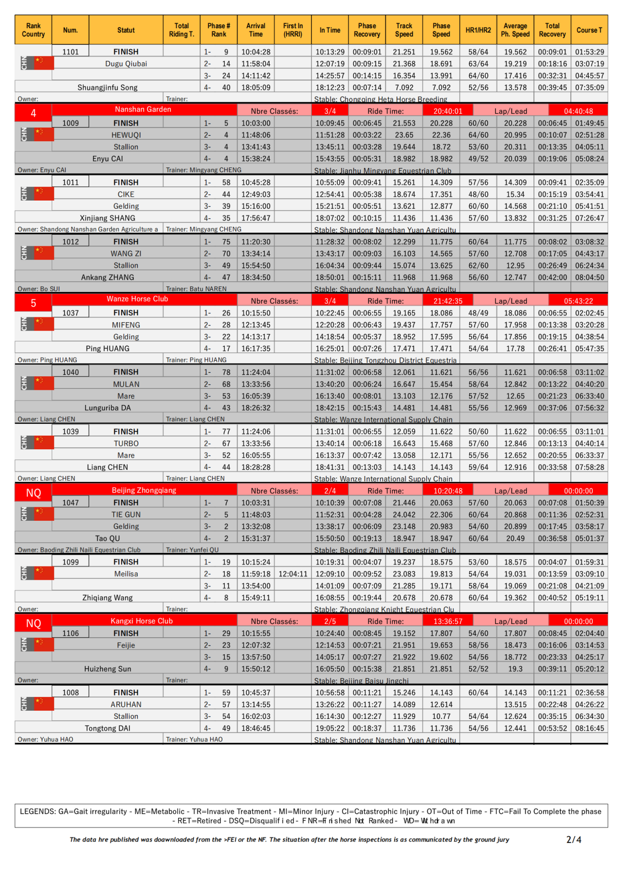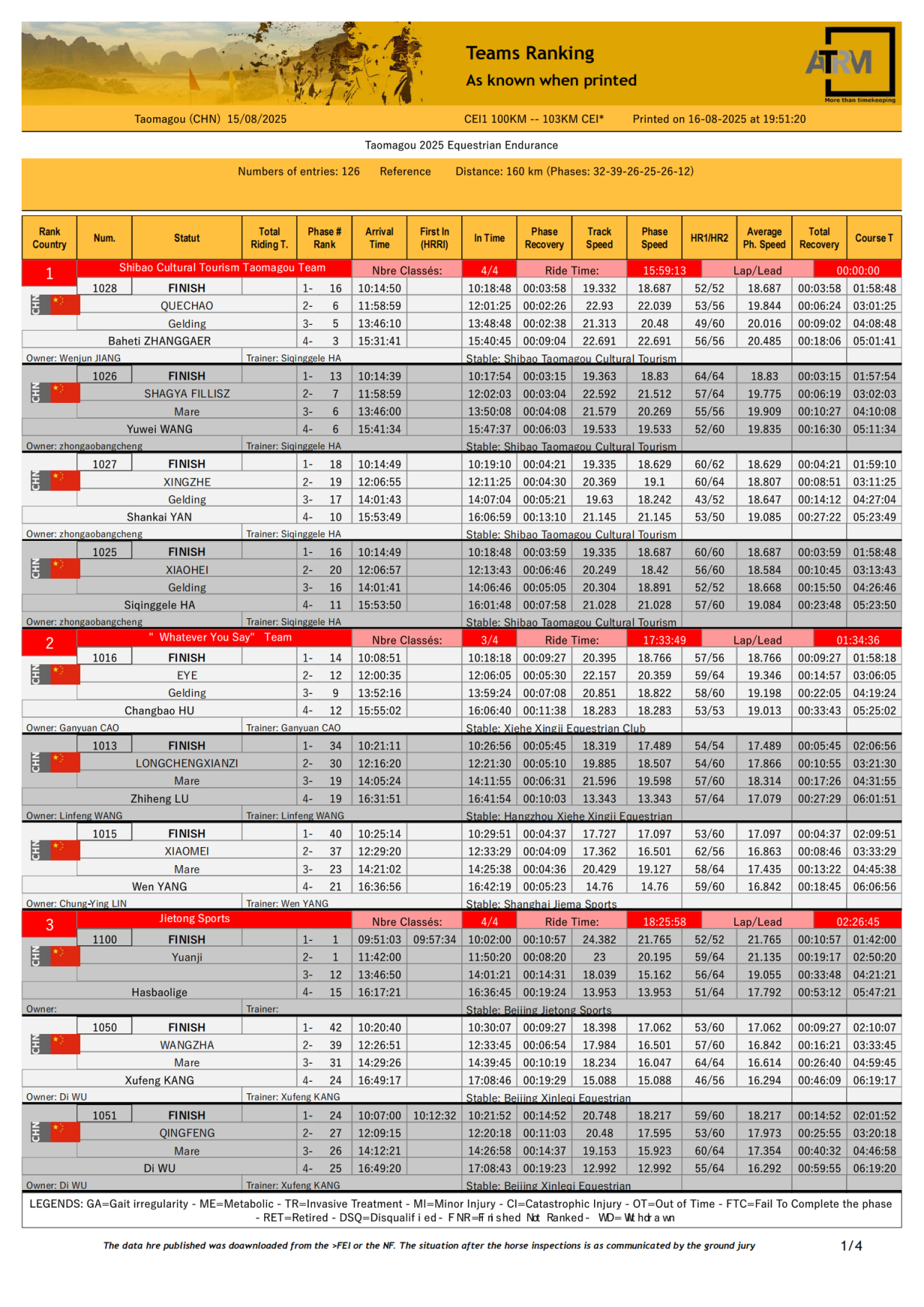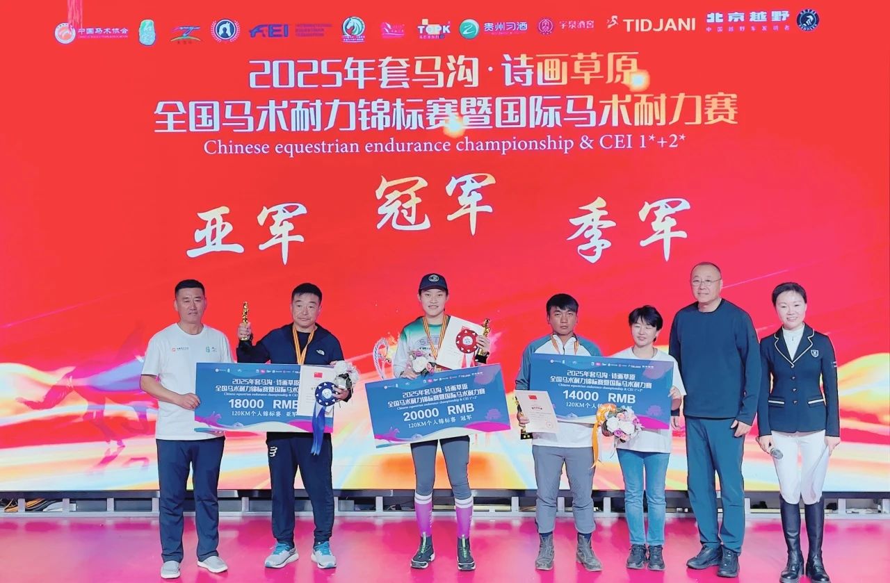 8月17日,全國(guó)馬術(shù)耐力錦標(biāo)賽暨國(guó)際馬聯(lián)(FEI)二星級(jí)馬術(shù)耐力賽在內(nèi)蒙古自治區(qū)包頭市達(dá)茂聯(lián)合旗套馬溝田園綜合體正式開賽。 120KM錦標(biāo)賽&國(guó)際馬聯(lián)CEI2* CIM 來自北京京馳馬會(huì)的騎手石夢(mèng)慈(騎手號(hào):2026)搭檔“煥影”一路領(lǐng)先,在賽段3時(shí)排名短暫落后到第二,隨后在賽段4重新回到第一,以19.5km/h的平均時(shí)速完賽,拿下了本場(chǎng)賽事的冠軍。 來自直隸馬會(huì)的騎手瞿云飛(騎手號(hào):2016)搭檔“我來了”和來自克什克騰旗烏蘭布統(tǒng)馬會(huì)的騎手魏金昆(騎手號(hào):2012)搭檔“哈里”分別落后冠軍15秒和18秒,以同樣19.5km/h的平均時(shí)速獲得亞軍和季軍。 120KM錦標(biāo)賽&國(guó)際馬聯(lián)CEI2* CIM賽頒獎(jiǎng)典禮 頒獎(jiǎng)嘉賓:中國(guó)馬術(shù)協(xié)會(huì)副秘書長(zhǎng)、 競(jìng)賽部部長(zhǎng)孫立生先生(右二) 今年16歲的石夢(mèng)慈接觸耐力賽一年,與“煥影”共同訓(xùn)練了1個(gè)月,她表示,這次的賽道較難,對(duì)自己和馬來說都有一定挑戰(zhàn)性。此次奪冠,她非常感謝北京京馳馬會(huì)強(qiáng)大的后援團(tuán),也特別感謝父母的支持與陪伴。 石夢(mèng)慈接受采訪 賽后數(shù)據(jù)顯示,冠軍石夢(mèng)慈與“煥影”在完成比賽各賽段后,心率恢復(fù)到規(guī)定標(biāo)準(zhǔn)所需的時(shí)間為全場(chǎng)最短;季軍魏金昆搭檔“哈里”在賽段4達(dá)到了24.6km/h的全場(chǎng)最高時(shí)速。 8月16日?qǐng)F(tuán)體賽成績(jī)公布 石寶文旅套馬溝隊(duì)獲得100KM錦標(biāo)賽團(tuán)體冠軍,隊(duì)員包括:丈嘎爾·巴合提(搭檔“雀巢”)、王玉偉(搭檔“瑞雪”)、嚴(yán)山凱(搭檔“行者”)和哈斯青格樂(搭檔“小黑”)。 |