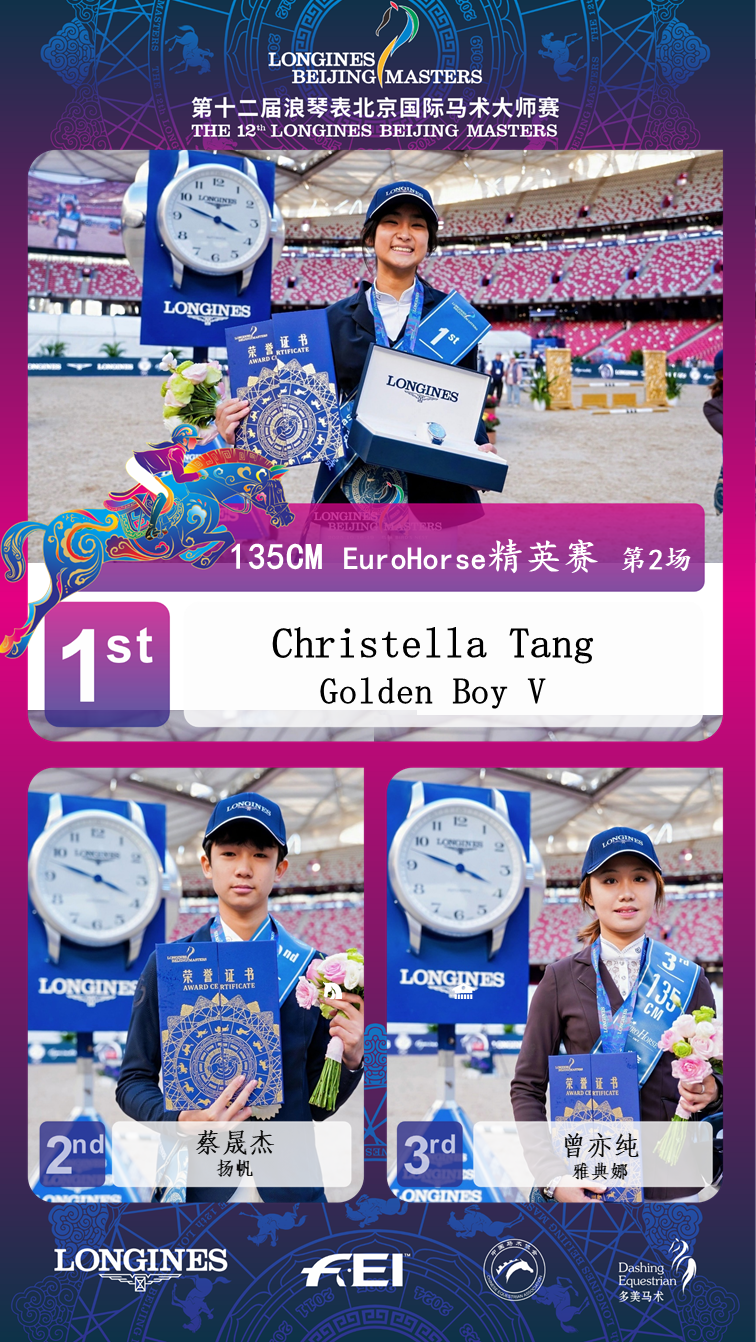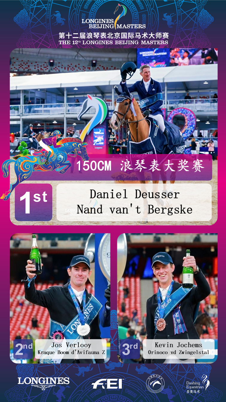 [2025年10月19日]第十二屆浪琴表北京國際馬術大師賽圓滿完成收官日的爭奪戰(zhàn)!從100CM團體賽的默契協(xié)作,到105CM公開賽的精準爭時;從135CM EuroHorse精英賽決賽的激烈角逐,到150CM浪琴表大獎賽的壓軸對決,賽場上每一次呼吸都交織著信任的共振,每一個跨越都標記著信念的刻度。 上午8:00的100CM團體賽中,悅林馬術憑借三位騎手的出色發(fā)揮成功登頂!騎手侯僑軒策騎擎天柱、翁敬涵搭檔念月、顧馨悅與吉爾協(xié)同發(fā)力,以4罰分、176.29秒的成績奪冠。海外騎際馬術以4罰分、179.85秒獲得亞軍,中聯(lián)騎士聯(lián)盟以4罰分、194.85秒摘得季軍!每支戰(zhàn)隊的人馬同心,都是賽場最動人的風景。 上午12:45,105CM公開賽圓滿完賽!騎手張羽翔策騎“辰美麗”憑借精彩表現(xiàn)以零罰分、48.60秒的出色表現(xiàn)奪得冠軍!安佳琪策騎“恩九拉”以零罰分、49.24秒的成績獲得本場比賽亞軍;沈紫昕策騎“小灰灰”以零罰分、50.22秒收獲季軍。 下午13:50開賽的EuroHorse精英賽135CM中,澳大利亞騎手Christella Tang與策騎Golden Boy V以零罰分、48.20秒的驚艷表現(xiàn)斬獲冠軍,人馬配合如行云流水,每一次躍起都是力與美的極致展現(xiàn)。蔡晟杰與“揚帆”以4罰分、45.64秒收獲亞軍,曾亦純搭檔“雅典娜”以4罰分、50.23秒的成績位列季軍。 下午16:40,壓軸的150CM浪琴表大獎賽更將賽事推向巔峰,爭奪激烈!11對人馬組合成功晉級附加賽,不僅展現(xiàn)了馬術運動的獨特魅力,更讓現(xiàn)場及屏幕前的觀眾全程熱血沸騰!德國騎手丹尼爾·杜瑟(Daniel Deusser) 策騎“Nand van't Bergske”歷經一輪爭時賽與附加賽的極致考驗,最終以0罰分、46.39秒的完美表現(xiàn)力壓群雄,加冕冠軍!這場終極較量不僅是對技術的淬煉,更是對心態(tài)的頂級考驗,丹尼爾·杜瑟的勝利完美詮釋了人馬合一的巔峰境界。喬斯·維羅伊(Jos Verlooy)與戰(zhàn)駒Kraque Boom d'Avifauna Z以0罰分、47.59秒的出色成績斬獲亞軍;凱文·喬赫姆斯與(Orinoco vd Zwingelstal) 以0罰分、47.82秒收獲季軍。 當最后一道騰躍劃過賽場,2025第十二屆浪琴表北京國際馬術大師賽正式落下帷幕!這場匯聚頂尖騎手的馬術競技盛宴,以速度與優(yōu)雅的極致碰撞、人馬同心的默契,為所有觀眾留下了諸多直擊人心的震撼瞬間。 圖|150CM 浪琴表大獎賽頒獎典禮 圖|150CM 浪琴表大獎賽冠亞季軍慶祝儀式 讓我們共同期待明年十月再度相聚鳥巢,共同見證新傳奇的誕生,續(xù)寫馬術運動的璀璨篇章 |