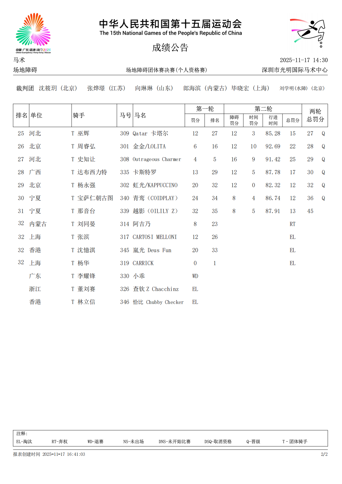 11月17日,中華人民共和國第十五屆運(yùn)動會馬術(shù)場地障礙團(tuán)體賽暨個人資格賽在深圳光明國際馬術(shù)中心順利舉行,書寫了一場充滿變數(shù)的賽場故事。 從第一輪上海隊(duì)13罰分領(lǐng)跑展現(xiàn)的精準(zhǔn)操控,到第二輪廣西隊(duì)以29分總罰分逆襲登頂?shù)姆€(wěn)健發(fā)揮,九支隊(duì)伍在障礙間的每一次起跳、每一次落地,都既藏著人馬協(xié)作的默契,也帶著競技體育的未知。 這場賽事不僅誕生了新的冠軍,也讓觀眾看到了不同隊(duì)伍在挑戰(zhàn)面前的堅(jiān)守與突破。 第一輪:上海隊(duì)驚艷領(lǐng)跑,傳統(tǒng)強(qiáng)隊(duì)暫居中游 團(tuán)體賽成績計(jì)取每輪最佳3對人馬組合總罰分,兩輪累計(jì)罰分低者勝出。 上海隊(duì)以 13 分的超低罰分驚艷全場,強(qiáng)勢占據(jù)榜首位置。騎手楊華搭檔馬匹 “CARRICK” 以完美表現(xiàn)拿下全場唯一的零罰分,同隊(duì)騎手鄭文杰搭檔馬匹“咚咚”僅因速度稍慢獲得了1分時間罰分。 緊隨其后的是河北隊(duì),人均僅打落一桿,得到14分的罰分,暫列次席。排名第三的內(nèi)蒙古隊(duì)則穩(wěn)扎穩(wěn)打,首輪先獲得16罰分。 內(nèi)蒙隊(duì)騎手張睿搭檔“ORINCO VD ZWINGELST” 圖/何亦紅 最終的冠亞軍在首輪并未展現(xiàn)出絕對優(yōu)勢,廣東隊(duì)以17罰分暫列第四,廣西隊(duì)18罰分排名第五。 第二輪:廣西隊(duì)逆襲,上海隊(duì)遺憾止步 廣西隊(duì)在第二輪強(qiáng)勢反擊:木拉得力與“輕七尺”率先交出零罰分,兩名隊(duì)友雖各落一桿,但全隊(duì)仍以 11 分的單輪罰分(總罰分 29)實(shí)現(xiàn)大逆轉(zhuǎn),從首輪第五一路沖到冠軍位置。 這枚金牌,是廣西馬術(shù)隊(duì)參加全運(yùn)會以來的第一枚金牌,也為他們寫下了真正意義上的歷史時刻。 “上屆全運(yùn)會我也代表廣西隊(duì)出戰(zhàn),但因1分時間罰分,隊(duì)伍遺憾無緣前三。這一屆非常非常幸運(yùn),能夠與三位首次來到全運(yùn)會賽場的隊(duì)友一起贏得金牌,創(chuàng)造屬于我們的歷史。”賽后接受馬術(shù)在線記者采訪時,廣西隊(duì)騎手木拉得力激動地說道。 廣西隊(duì)騎手木拉得力搭檔馬匹 “輕七尺” 圖/何亦紅 廣西隊(duì)騎手洪志華(左)哈扎克拜(右) 圖/何亦紅 作為全運(yùn)會上的常年勁旅,廣東隊(duì)本輪依舊發(fā)揮穩(wěn)健。梁銳基搭檔“極光“輕盈完賽,獲得1分時間罰分,全隊(duì)總罰分30,僅以1分之差惜獲亞軍。 廣東隊(duì)騎手梁銳基搭檔馬匹“極光“ 圖/何亦紅 廣東隊(duì)騎手李振強(qiáng)搭檔馬匹“Kenjoy VAN DE SPELONC KHOEVE” 圖/何亦紅 內(nèi)蒙古隊(duì)緊隨其后,全隊(duì)最后登場的騎手達(dá)日瑪搭檔“薩拉”頂住壓力,只因速度稍慢獲得1分時間罰分。最終隊(duì)伍成功保持住了第一輪的排名,以31分總罰分收獲季軍。 內(nèi)蒙古隊(duì)騎手們進(jìn)行勝利騎乘 圖/何亦紅 內(nèi)蒙古隊(duì)騎手達(dá)日瑪搭檔“薩拉” 圖/何亦紅 而首輪領(lǐng)跑的上海隊(duì),在第二輪遭遇了意外挑戰(zhàn):在僅有三對人馬組合參賽的情況下,首輪唯一一位零罰騎手楊華的搭檔馬匹“CARRICK“在場上兩次不服從,根據(jù)規(guī)則被判罰淘汰,最終隊(duì)伍因有效成績不足三人,未能計(jì)入總排名。 在個人資格賽中排名前30的人馬組合晉級決賽,將于11月19日展開對決,晉級名單如下。 十五運(yùn)馬術(shù)項(xiàng)目的壓軸之戰(zhàn)即將登場,場地障礙個人決賽的勝負(fù)往往在瞬息之間定奪。賽事看點(diǎn),不容錯過!關(guān)注馬術(shù)在線公眾號,第一時間獲得戰(zhàn)報(bào)速遞! 文/劉桐溪 圖/何亦紅 |