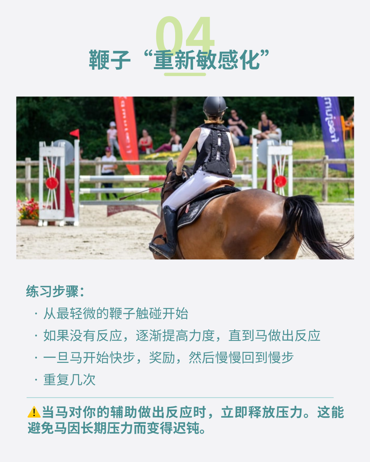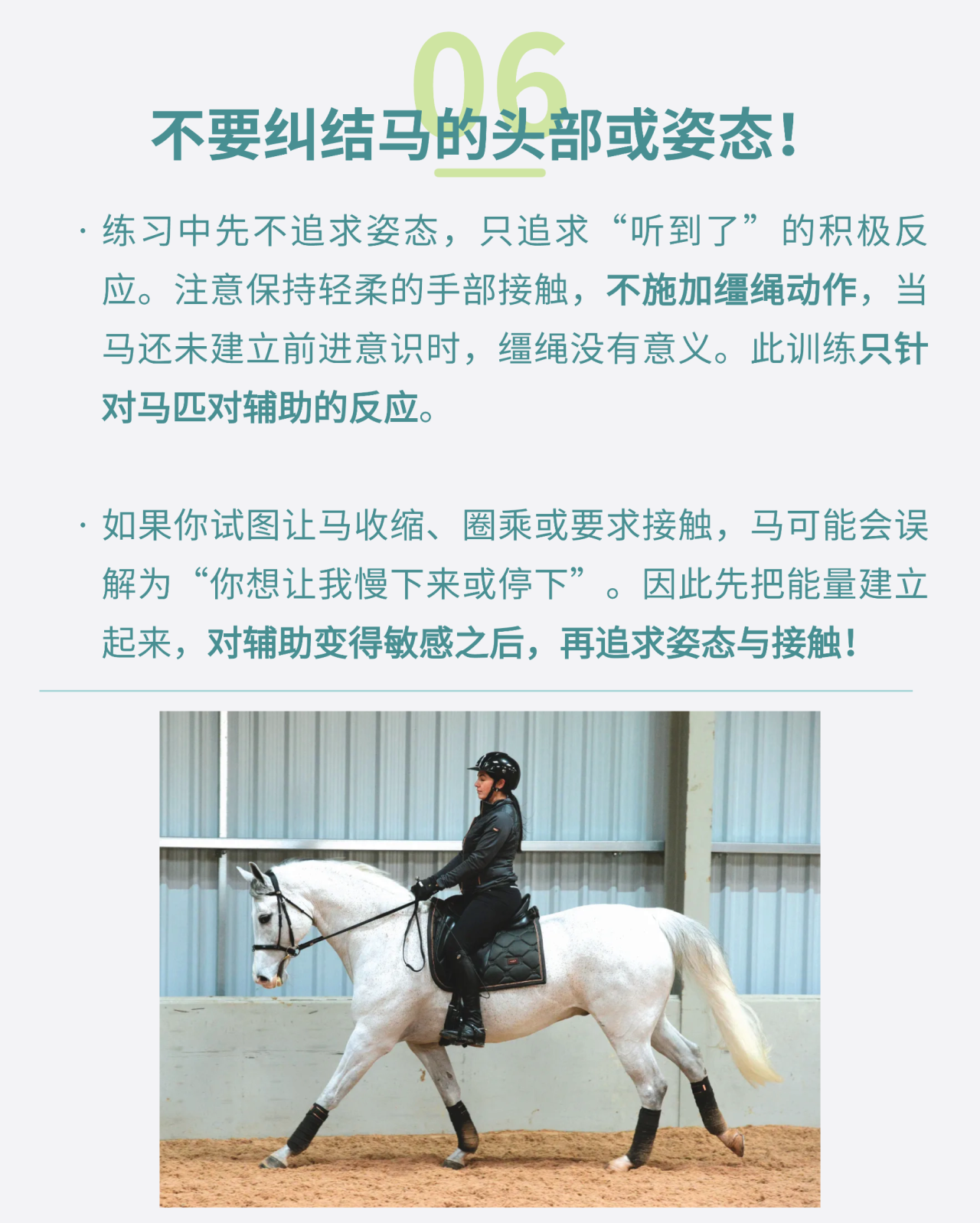 你是否常覺得自己拼命想讓馬“向前”,而你的馬卻步伐慢吞吞、反應(yīng)懶洋洋?事實上,馬天生并不懶,它們非常敏感,就連蒼蠅落在身上都能感受到。所以對騎手的輔助(Aid)遲鈍并非天性,而是訓(xùn)練中逐漸形成的習(xí)慣。通過正確的方法,你完全可以重新喚醒馬對輔助的敏感性。 喚醒馬,也是在喚醒騎手的訓(xùn)練思維。通過讓輔助更清晰、獎勵更及時,你不僅能讓馬重新敏感、有動力,也能讓整個騎乘過程變得輕松愉快。訓(xùn)練目標不是“讓馬變快”,而是 讓馬愿意回應(yīng)你。 |