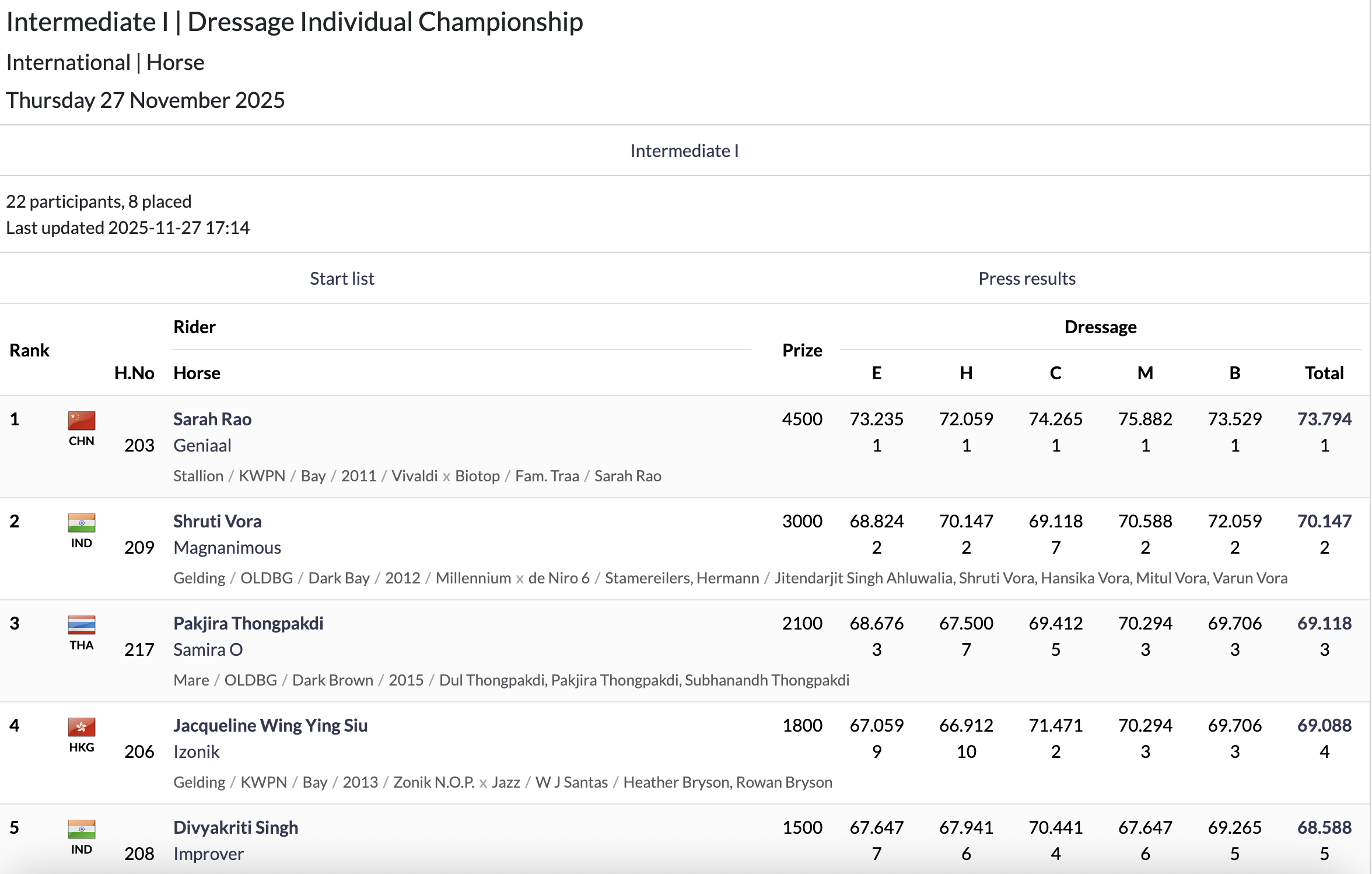 2025年11月27日下午,國(guó)際馬聯(lián)亞錦賽盛裝舞步第一中級(jí)個(gè)人賽(Intermediate I | Dressage Individual Championship)在泰國(guó)芭提雅圓滿落幕。 剛剛獲得第十五屆全運(yùn)會(huì)盛裝舞步團(tuán)體冠軍的中國(guó)騎手饒嘉怡,馬不停蹄投身國(guó)際賽場(chǎng),她搭檔杭州亞運(yùn)會(huì)老搭檔——馬匹“木法沙(Geniaal)”出戰(zhàn),以73.794分的優(yōu)異成績(jī)力壓群雄,領(lǐng)先第二名3.6個(gè)百分點(diǎn),成功將該項(xiàng)目金牌收入囊中。 據(jù)悉,11月30日(本周日),饒嘉怡將繼續(xù)攜手“木法沙”征戰(zhàn)自由演繹個(gè)人賽決賽。 ———————————————————— 這位與馬術(shù)結(jié)緣二十余載的騎手,10歲初涉馬房,15歲便遠(yuǎn)赴英國(guó)接受專業(yè)系統(tǒng)訓(xùn)練,憑借過(guò)人天賦與不懈努力,早已在國(guó)際賽場(chǎng)嶄露頭角。不僅在法國(guó)勒芒站等多項(xiàng)國(guó)際賽事中登頂,更曾助力中國(guó)隊(duì)斬獲杭州亞運(yùn)會(huì)盛裝舞步團(tuán)體銀牌。此次亞錦賽奪冠,無(wú)疑是她職業(yè)生涯的又一重要里程碑。 比賽成績(jī)公示(前五名) 賽后接受馬術(shù)在線記者專訪時(shí),饒嘉怡分享了參賽心得:“本次參賽的馬匹均從歐洲直接運(yùn)抵賽場(chǎng),這樣的安排最大程度保障了馬匹的競(jìng)技狀態(tài)。此次賽事匯聚了亞洲8個(gè)國(guó)家和地區(qū)的頂尖騎手,整體競(jìng)技水平很高,對(duì)人馬組合來(lái)說(shuō)都是不小的挑戰(zhàn)。幸運(yùn)的是,來(lái)到泰國(guó)后,‘木法沙’得到了悉心照料,比賽中狀態(tài)絕佳。我們?cè)趧?dòng)作細(xì)節(jié)上做到了精益求精,全程沒(méi)有出現(xiàn)明顯失誤,能拿下這塊金牌真的非常驚喜?!?/div> 談及大賽備戰(zhàn)的關(guān)鍵,饒嘉怡補(bǔ)充道:“對(duì)運(yùn)動(dòng)員而言,大賽前保持穩(wěn)定的生活節(jié)奏和訓(xùn)練習(xí)慣至關(guān)重要,這是維持最佳競(jìng)技狀態(tài)的核心前提。” 從六年前帶著第一匹圣喬治馬初登亞錦賽舞臺(tái),到如今終于站上最高領(lǐng)獎(jiǎng)臺(tái),饒嘉怡用六年堅(jiān)守詮釋了“厚積薄發(fā)”的真諦。 “盛裝舞步是一條需要耐下心來(lái)慢慢走的路,”她感慨道,“我希望我的經(jīng)歷能鼓勵(lì)更多中國(guó)年輕騎手,坦然面對(duì)成長(zhǎng)路上的起伏,悅納順境也接納坎坷,不驕不躁,沉心學(xué)習(xí)積淀,未來(lái)在更廣闊的舞臺(tái)上綻放光芒。” 值得一提的是,饒嘉怡本次比賽所穿的燕尾服來(lái)自品牌 OU.歐,采用中國(guó)非物質(zhì)文化遺產(chǎn)技藝制作的香云紗面料,將中國(guó)傳統(tǒng)之美帶上了亞錦賽賽場(chǎng)。“把中國(guó)非遺帶到國(guó)際賽場(chǎng),向世界展現(xiàn)中國(guó)的實(shí)力,展現(xiàn)中國(guó)文化的深厚底蘊(yùn),是我特別想做的事?!彼难哉Z(yǔ)與行動(dòng),讓金牌之外更添了一份文化傳承的溫度。 夕陽(yáng)下的芭提雅賽場(chǎng),饒嘉怡與“木法沙”的身影定格成最美風(fēng)景。這份跨越六年的堅(jiān)守與榮光,不僅是個(gè)人奮斗的勛章,更是中國(guó)馬術(shù)事業(yè)穩(wěn)步發(fā)展的縮影。我們期待在周日的自由演繹決賽中,這位兼具實(shí)力與情懷的中國(guó)騎手能繼續(xù)帶來(lái)精彩表現(xiàn),也期盼未來(lái)有更多中國(guó)騎手帶著夢(mèng)想與文化自信,在國(guó)際馬術(shù)舞臺(tái)上書寫屬于中國(guó)的精彩篇章。 文/劉桐溪 圖/Harry Sykes |