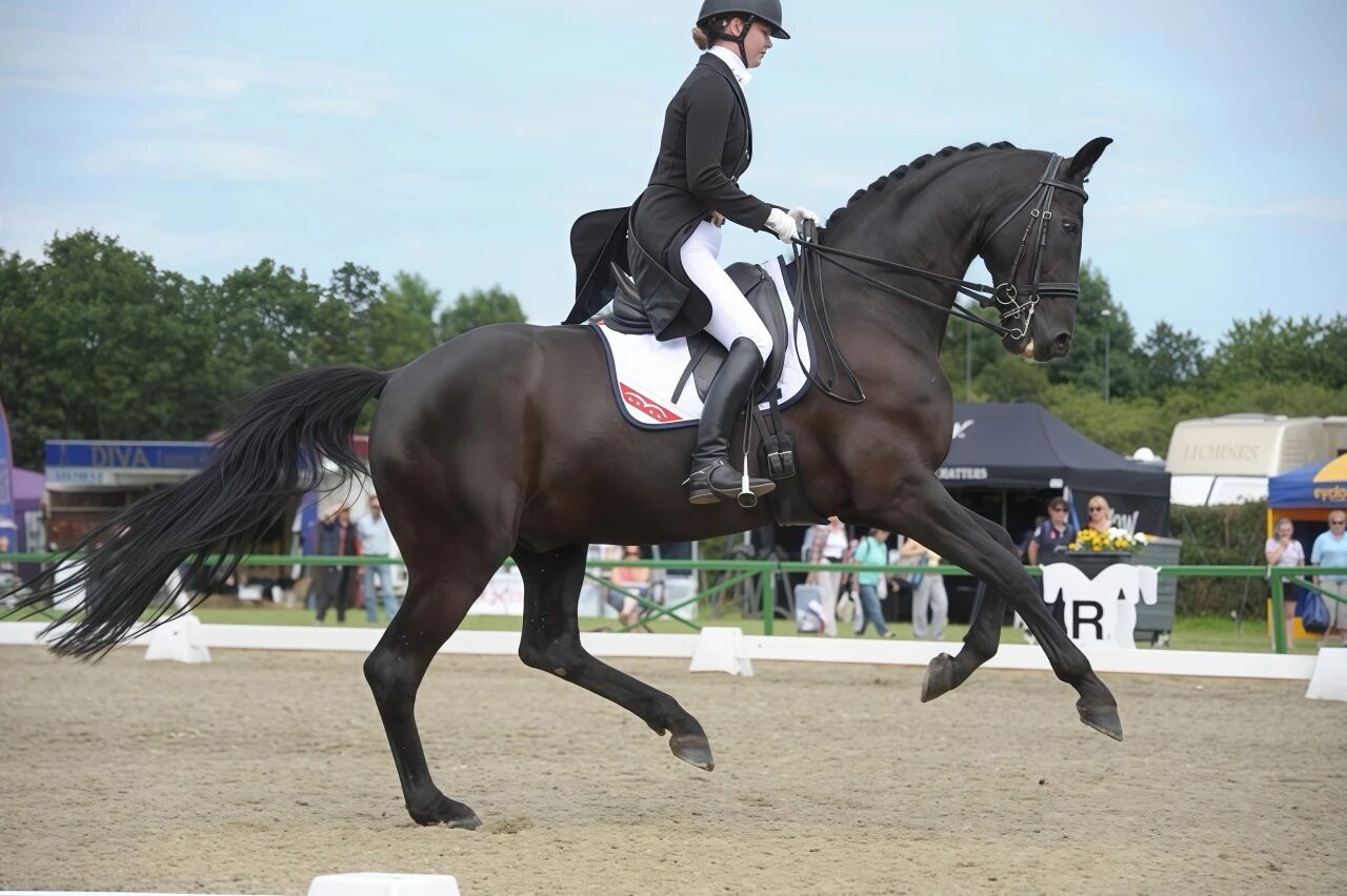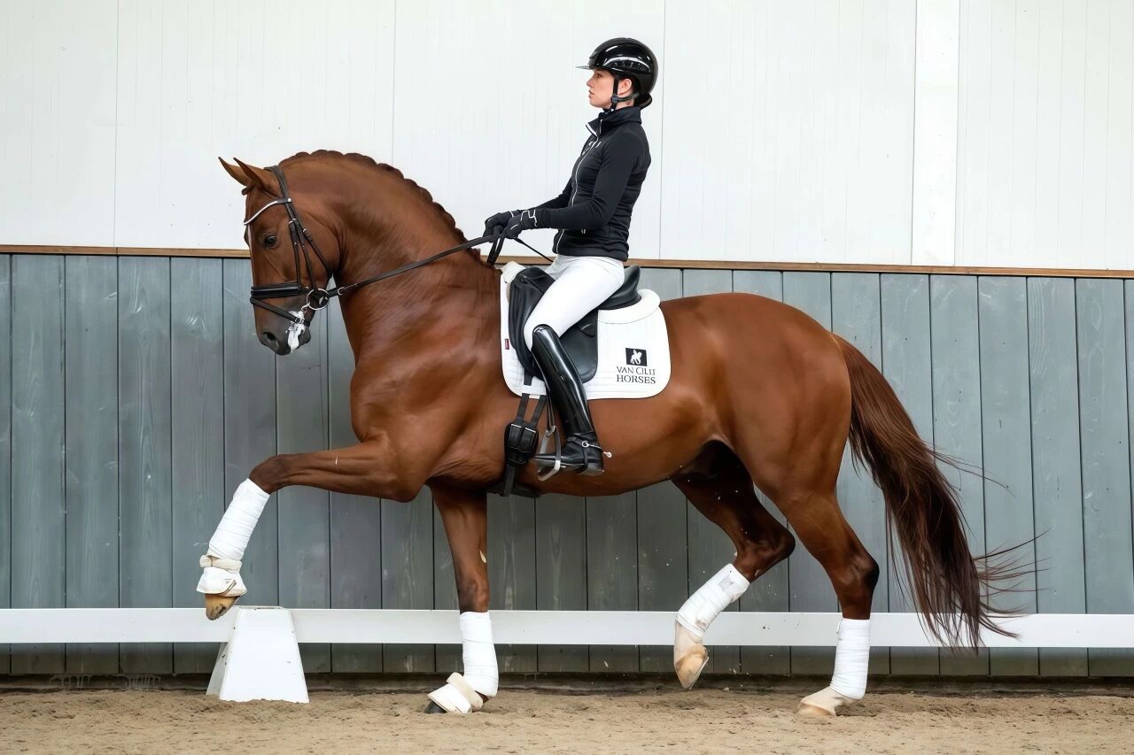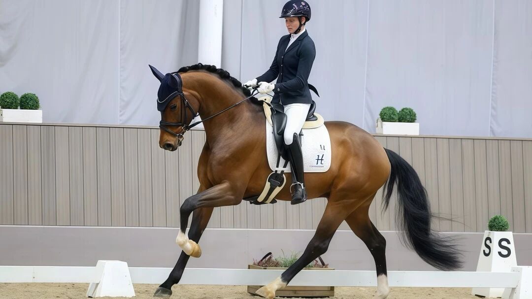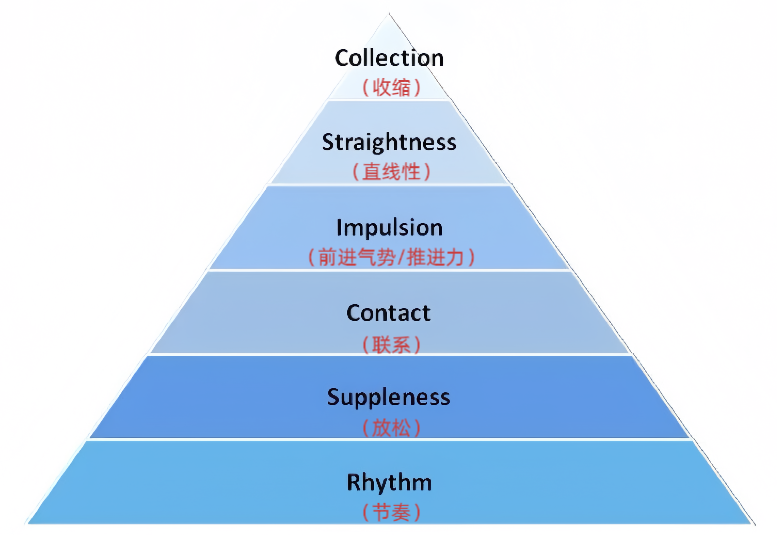 二、節(jié)奏與放松 不是“動起來就行”,而是馬的身體是否已經(jīng)具備承載訓(xùn)練的能力。 訓(xùn)練金字塔核心六要素 在德國訓(xùn)練金字塔中,節(jié)奏與放松位于最底層。這是生物力學(xué)的必然結(jié)果:一匹不放松的馬,無法正確使用背部;而背部不能工作,所有“后續(xù)訓(xùn)練”都會變成代償。 很多人以為“放松”是情緒問題,但在年輕馬身上,它首先是指身體狀態(tài): 放松的馬——步伐長度穩(wěn)定;背部在運(yùn)動中有“擺動感”;在輕接觸下仍能保持節(jié)奏。 未放松的馬——步態(tài)節(jié)拍不穩(wěn);背部僵硬,轉(zhuǎn)彎時(shí)容易縮步;一旦韁繩介入,身體立刻變緊。 一個(gè)常見誤區(qū) 過早追求“受銜”外形,往往會制造放松假象:馬的頭低了,但背沒有參與,問題只是被掩蓋。 三、前進(jìn)氣勢與縱向平衡 關(guān)注的不是讓馬跑的“更快”,而是它的動力是否真正來自后肢 當(dāng)心理穩(wěn)定、節(jié)奏清晰、身體放松之后,訓(xùn)練才真正進(jìn)入力量方向的調(diào)整階段。這一階段的核心,不是制造更大的向前速度,而是開始重建馬匹的縱向平衡。在訓(xùn)練體系中,這一步對應(yīng)的是前進(jìn)氣勢/推進(jìn)力(Impulsion),但這個(gè)詞經(jīng)常被誤解。 前進(jìn)氣勢 ≠ 速度 從生物力學(xué)角度看,年輕馬的重心天生偏前,前肢大約承擔(dān) 60% 的體重。如果訓(xùn)練中只是單純追求速度,身體并不會變的平衡,反而會把更多的負(fù)荷繼續(xù)壓在前肢上。 真正的前進(jìn)氣勢,指的是: