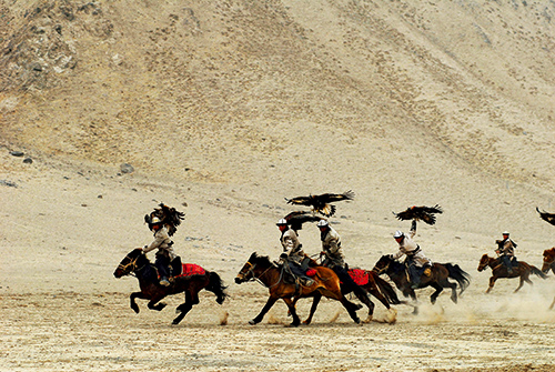 中亞干燥的戈壁灘上,一隊柯爾克孜獵人騎馬架鷹,逡巡在灌木與亂石中間,他們的眼神如雄鷹一樣敏銳。一只灰色的野兔伏在土坷中,幾乎與周圍成一色,但還是被獵人們發(fā)現(xiàn)了。默契的手勢、眼神,幾駕坐騎分列包抄,伺機(jī)而動。野兔似乎預(yù)感到了什么,飛快竄逃,與此同時,獵人胯下的輕騎也迅速出發(fā),馬蹄撩起的狂沙煙塵中,獵人手臂上的雄鷹俯沖而下,野兔在地面奔突,獵鷹在后面追逐,直至其有力的雙爪將野兔牢牢抓住。 阿合奇,柯爾克孜語為“白芨芨草”,這是一種在高原荒漠中頑強(qiáng)生長的小草,耐干旱、耐鹽堿。同時“阿合奇”也是柯爾克孜自治州的名稱。這個位于中國最西部天山南脈腹地的邊陲小縣,戈壁、荒漠、連綿的雪山似乎是唯一能看到的風(fēng)景。在這里,騎馬狩獵的傳統(tǒng)還在堅守著。 老夫聊發(fā)少年狂。左牽黃,右擎蒼,錦帽貂裘,千騎卷平岡。為報傾城隨太守,親射虎,看孫郎。 酒酣胸膽尚開張。鬢微霜,又何妨!持節(jié)云中,何日遣馮唐?會挽雕弓如滿月,西北望,射天狼。 ——蘇軾《江城子· 密州出獵》 風(fēng)沙迷遠(yuǎn)客,冷月迎故人。遠(yuǎn)客如風(fēng)而來,帶起的塵埃,也隨著風(fēng)沙消彌在大漠中,身后是無盡的黃沙。我來到這里時已是冬末,正是接近狩獵季節(jié)的尾聲了。牧民們通常在冬季狩獵,因為在雪地上比較容易辨認(rèn)動物的腳印,另外夏天是獵鷹脫毛的季節(jié),天氣太熱它們是飛不起來的。獵鷹最好的狀態(tài)是在冬季。阿合奇雅郎奇村的別克家族有兄弟八個,我住在其中的一個兄弟馬坎兒·別克的家里。 馬坎兒的幾個兄弟都顯得穩(wěn)重成熟、風(fēng)度翩翩,全是騎馬打獵的好手。馬坎兒今年 50 歲,是鎮(zhèn)上的駐村干部,已經(jīng)為村里工作 18 年了,家里養(yǎng)了 16 匹馬,幾百頭牛羊;最年長的大哥肉賽姆·別克,雖已 60 歲,仍然可以架鷹在馬背上馳騁,形態(tài)威儀;42 歲的蘇里塔尼·別克在托什干河谷的亂石灘上,飛速奔馳好幾公里,及時拉住了我那匹快馬的韁繩。 過去以游牧為生的柯爾克孜族,傳承了從祖先那里流傳下來的馴鷹技藝。在白雪覆蓋的闊克薩勒山、喀拉鐵克山上,他們經(jīng)常騎馬到高達(dá)近百米的山頂上,將自己馴養(yǎng)的鷹放飛。除了獵狗外,獵鷹是他們傳統(tǒng)的捕獵利器,是他們用以捕捉野兔、野雞、狐貍等獵物的好幫手。近些年來由于生活方式的演變,柯爾克孜族基本定居了,不再以打獵為生,獵鷹的作用越來越小。別克家有好幾個兄弟都到縣城工作去了,比如肉扎洪·別克,就曾在縣上任武裝部長,組織干事;艾山·別克現(xiàn)在是縣人民醫(yī)院的副院長;坎加洪·別克是縣旅游局的干部兼司機(jī)。但阿合奇當(dāng)?shù)氐哪撩駛內(nèi)匀粚⒋俗鳛橐环N文化的傳承,家家戶戶馴養(yǎng)獵鷹。 馬坎兒和我們聊起鷹來仍然很地道,他說獵鷹有 60 種,其中有 40 種可以單獨抓獲獵物養(yǎng)活自己。獵鷹與獵鷹之間的區(qū)別是很細(xì)致的,有的爪、嘴、翅膀上有細(xì)細(xì)的皺紋;有的爪是青黑色的,有的爪是黃色的;翅膀上的毛有的像白楊樹的葉子,有的像柳樹的葉子……年紀(jì)大的老人們可以把不同種類的獵鷹細(xì)細(xì)分辨出來。另外獵鷹的體型也各不相同,如在阿合奇的哈拉布拉克鄉(xiāng),有種鷹叫“柯然博孜”,肩膀比較寬,是個很兇猛的品種;在喀什地區(qū)的阿克陶,有種鷹的爪子外面有個洞,甚至可以穿過一根筷子。鷹的雌雄也很難區(qū)分,柯族的老馴鷹人說,個頭小的是公的,個子大的是雌的。鷹是種長壽的鳥類,普遍能活 40-60 年,一般通過毛色來看年齡,年齡大的鷹毛色全身變黑,而年輕的鷹翅膀下面有很多白毛。 近幾年,國家為了保障牧區(qū)動植物生態(tài)平衡,相繼出臺了限制捕獵的法規(guī),牧民馴養(yǎng)一只獵鷹首先要到所在地的林業(yè)部門申報登記,領(lǐng)取了《馴養(yǎng)許可證》后才能飼養(yǎng)。在阿合奇周邊的山里,獵鷹通常棲息在山麓間的開闊地、河谷灌木叢里。柯爾克孜人抓鷹的時候是很講究的,一般有三種方法:一種是直接去高山上的鷹巢里抓,但是出于保護(hù)的考慮,只能抓其中的一兩只,不能全部抓走;第二種方法是誘捕,把以前抓的鷹放在地上,旁邊用鐵夾子夾住一只兔子,老鷹想吃卻夠不到,天上的鷹看到它的動作,沖下來捕獲獵物的時候,被夾住;第三種方法也類似誘捕,選擇天氣晴朗的時候,在戈壁灘上搭四個細(xì)細(xì)的柱子,上面罩上網(wǎng),網(wǎng)下放置兔子等獵物,在兔子的腳上綁上繩子,當(dāng)人在遠(yuǎn)處拽動繩子的時候,兔子也跟隨竄動,引來老鷹,而鷹的視力只能分辨黑白,對綠色的網(wǎng)子是看不到的,在它沖下來的時候,就會被網(wǎng)子裹住。馬坎兒的鷹是用第二種方法抓到的,他說用第一種方法抓到的鷹,自幼養(yǎng)大,很有感情,到了時候都舍不得放走。另外幼鷹由人類養(yǎng)大,性格老實、膽小,也會失去一定的野性。所以現(xiàn)在他們只抓成年的鷹。 抓鷹最好的時間是在九月,這時候是一年之中鷹最胖的時候,比較容易抓到。不過八到十歲成年的鷹不太好馴,幾乎要馴一年才能放。馬坎兒的鷹是 2009 年 2 月中旬抓來的,可馴了九個月后卻自行跑掉了。他今年冬天準(zhǔn)備再抓一只。 出于動物保護(hù)的考慮,國家現(xiàn)在規(guī)定抓回來的鷹都要進(jìn)行登記,過兩三年要放掉,