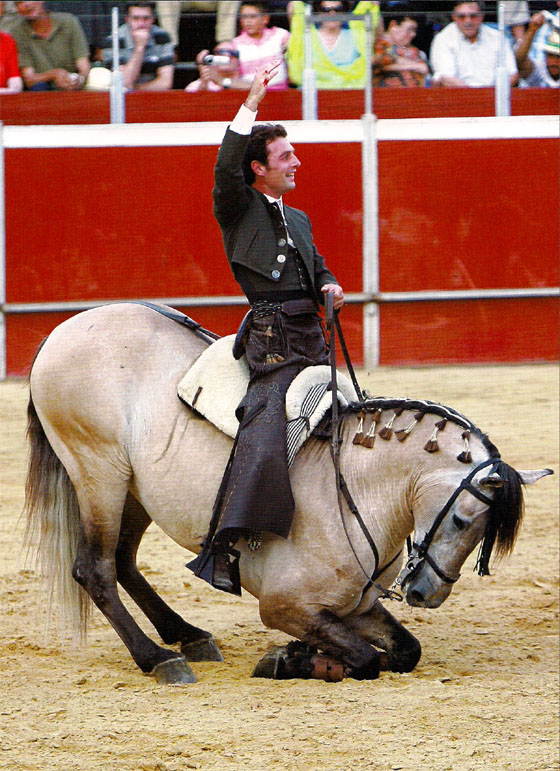 陽光是西班牙的特產(chǎn),傳統(tǒng)斗牛是西班牙的特色。不要錢便可享受的陽光灑得滿街都是,要錢才能觀看的傳統(tǒng)斗牛也比比皆是。然而一場真正的騎馬斗牛卻是難得一見的,就連很多西班牙人也沒有親眼見過。為了一睹其風(fēng)采,我們狂奔了600多公里趕到西班牙南部的San Victorino小鎮(zhèn)。小鎮(zhèn)上從來沒有中國人的到來,我們是第一批到訪該鎮(zhèn)的中國人。 騎馬斗牛是在當?shù)貢r間晚上七點開始的。我們提前了兩個小時趕到,場外的氣氛已是相當?shù)臒崃伊???盏厣喜⑴磐7胖vvolvo運馬車,每輛車的兩側(cè)各拴著三匹馬,共18匹。根據(jù)陪同我們的美國老太太Lisa介紹:其中有十匹馬為西班牙安達魯西亞馬,其余八匹馬是萄萄牙馬和美國夸特馬,三名騎手各自攜帶自己的六匹馬參加兩輪表演,每輪要換三匹馬殺死一頭牛。 騎手們開始熱身,身著盛裝,騎姿端正,神情淡定,高貴的氣質(zhì)從頭到腳流淌的淋漓盡致。馬的節(jié)奏均勻,步態(tài)輕盈,前肢輕揚,后肢工作充分,收放自如,訓(xùn)練有素,這是我在國內(nèi)和西班牙其他馬場從沒見過的。 騎手們?nèi)雸隽?,繞場一周向觀眾們致意,觀眾們用歡呼、用歌聲、用美酒給予回應(yīng)。斗牛還沒開始,場內(nèi)場外的氣氛已是相當?shù)臒崃?,騎手們和馬作出各種花樣動作,靈巧的斜橫步、高速的旋轉(zhuǎn)、長久的人立,竭盡所能地展示著、表演著、鼓動著。據(jù)說我們看到的是“戈雅式古典斗?!?,整套排場和服飾都是根據(jù)18世紀西班牙畫圣戈雅筆下的斗牛場面復(fù)原的。 第一位騎手登場了,我們叫他“老大”,他是今天三位騎手中年齡最大的,也是最有名氣的。Lisa說了他的名字,但一大串晦澀難講的發(fā)音實在難記,只記得他在以前的一次表演中被牛撞了,在家躺了將近兩年的時間,所有人都認為他再也騎不了馬了,然而今天他來了,很是出乎觀眾們的意料。老大手握長鏢和他的馬向公牛發(fā)起了挑逗,公牛也毫不畏懼地迎了上來,馬斜刺里躥了過去,原本是牛頭馬面相對,轉(zhuǎn)瞬間牛角指處卻變成了健碩的馬腚。老大優(yōu)雅地坐在馬背上不徐不疾地讓馬和公牛保持著一拳的距離,手中的長鏢指向著湛藍的天空。隨著公牛開始加速,他輕輕地前移了一點重心,還是保持著那份優(yōu)雅,馬也快了起來,不論公牛怎樣追,牛角和馬的身體始終保持著一拳的距離。就這樣跑了幾圈,公牛煩了,不動了,老大和他的馬也停住了。掉轉(zhuǎn)馬頭,此時牛頭馬面咫尺相對,他大聲地對公牛叫喊著,公牛好像聽懂了,無聲無息地又起動了,馬也動了起來,但不是躲避而是迎頭直上,眼看就要撞在一起,馬突然做了一個左里懷急轉(zhuǎn),繞到公牛的右側(cè),與此同時牛角已奮力抬起,劃過馬剛剛跑過的優(yōu)美的弧線上,此時老大甩掉了一切的優(yōu)雅,手握著的長鏢狠狠地砸了下來,然而偏了一點兒,毫厘之間長鏢順著公牛的左肩滑了下去,全場噓聲四起。公牛沒有出聲繼續(xù)向著老大和他的馬全力撞去,噓聲并沒有影響老大,和剛才一樣的動作奮力將長鏢插入了牛背,用力一撅,帶倒鉤的長鏢就留在公牛的脊背里了,長鏢的桿被拔了出來,一面紅色小旗順勢打開了。 老大騎在馬上倒提著鏢桿,讓那面小紅旗不停地在公牛的眉眼之間晃動著,招惹著,他還是優(yōu)雅地駕馭著自己的馬,如此又反復(fù)了兩次,牛背上已經(jīng)多了三支長鏢,鮮血順著公牛的雙肩流淌在場地上。公牛更加憤怒了,不停地向老大和他的馬發(fā)動著攻擊,這時一位助手上來了,晃動著手中的斗篷,把公牛吸引到一邊,老大趁勢換了一匹馬并拿起了三支筷子長的短鏢,繼續(xù)挑逗著因傷痛而奮力進攻的蠻牛。不一會兒公牛停住了,帶著受傷的身體站在場地中央。老大和他的馬也停住了,停在公牛只要抬頭一個箭步就能頂?shù)降奈恢?。他手舉短鏢抬眼望著觀眾,嘴角撇得很低作張牙舞爪狀。突然他指揮胯下的馬跳起了舞,馬的后腿釘在地上,前腿左右輪流抬起,他在馬背上也隨之左右搖擺,并且幅度越來越大,像喝醉了的堂吉訶德在馬上搖晃著,把近在咫尺的狂牛冷落在旁。 公牛再一次起動了,卷起一陣塵沙向馬的腹部撞去,陡然間馬不搖了人也不晃了,隨之馬橫向跨出一大步,躲開了這兇狠的一擊。人依然優(yōu)雅地坐在馬背上,沒有絲毫的緊張。公牛一擊未果,二擊又到,馬依然大幅度地橫向跨步,從正面看過去馬頭和馬尾幾平分成了兩節(jié),每每總在毫厘間全身而退,公牛的全速攻擊竟然沒有馬橫向移動的速度快。十幾步后在快速移動中馬突然作了一個大幅度的后肢定位前肢旋轉(zhuǎn),向外方騰挪過去,快速完成了個180度的旋轉(zhuǎn),轉(zhuǎn)到了公牛的左側(cè),就在牛馬相錯之際,老大手中的一支短鏢己牢牢的嵌入牛的脊背。馬的躲避、旋轉(zhuǎn),人的出手一氣呵成,令人叫絕。接下來老大催馬迎牛而上,本來左向跑步?jīng)_向牛的右側(cè),在接近牛的瞬間換成了右向跑步繞到牛的左側(cè),同樣在牛馬相錯的剎那,老大手中的第二支短鏢也牢牢的嵌入了牛背,電光火石間又是輪精彩的照面,牛背上又多了把短鏢,三支短鏢全部牢牢的釘在牛背上。助手們再次上來了把公牛吸引開,老大換上第三匹馬后拿起了那把致命的長劍,縱馬向狂牛奔了過去。一番挑逗之后,老大舉起了長劍向公牛的致命部位刺去,長劍從牛背刺入直沒劍柄,鮮血從公牛的口
