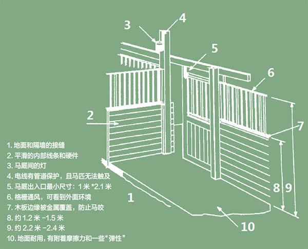 馬廄是馬房或庇護處的基本功能單元。乍一看,私家后院設計簡單、令人愉悅的馬廄和商業(yè)馬術俱樂部馬匹寄養(yǎng)設施相比,有所區(qū)別,但兩者都為馬匹和工作人員提供了適合的環(huán)境。在進行馬廄設計時,工作人員和馬匹安全是應主要考慮的因素。日常工作的便利與好的馬匹護理息息相關。不管是什么樣的管理風格或需求,安全的馬廄都具備一樣的基本元素。馬廄特點有很多選擇,不同的選擇關系到功能和費用支出。 馬廄尺寸 馬匹身高與馬匹每天在馬房的時間,決定了馬廄的大小。體型較大的馬比身型嬌小的pony 需要更多的空間,在馬房可以舒服地轉彎、躺下來和站起來。12 英尺( 約合3.6 米) 的馬廄是體重為1000磅(約合453.5 千克)馬匹的標準馬廄尺寸。實際上,很多馬房尺寸雖稍微小于這個數(shù)據(jù),也很成功,但不建議長度小于3 米??傮w來講,馬廄的長度應是馬匹身長的1.5 倍。在馬房的時間越長或馬匹越活躍,馬廄的尺寸需要越大。如果是母馬和駒子居住的馬廄,可以把2 個馬廄中間的格擋拆除。馬廄隔墻的標準高度為8 英尺(約合2.4 米)。不能低于7.5 英尺(約合2.2 米),防止馬匹后踢時,腿高過墻。很多馬匹后踢的高度可以達到7 英尺(約合2.1 米)。雖然常年建議馬廄隔墻8 英尺(約合2.4米)高,門口寬度4 英尺(約合1.2 米),但這個尺寸在馬房中并不常見。廠家提供的尺寸通常是7英尺(約合2.1 米)多一點,寬度在3.5 英尺(約合1 米)到3.75 英尺(約合1.1 米)之間。這個尺寸其實是馬匹通過的實際尺寸,也足以確保人馬安全。 馬房天花板的高度通常是10 英尺(3 米)到12 英尺(約合3.6 米),至少為8 英尺(約合2.4 米)。低的天花板不僅抑制通風,而且也增加了馬匹頭部撞到天花板的危險。事實上,很多馬房都有開放式桁架或椽結構,沒有天花板。這種情況下,按照最低高度設計的馬房,馬匹頭部可能會撞到燈或桁架。(未完待續(xù)) 資料搜集與整理/ 王彥桃(天星調良馬術) 圖/ 天星調良國際馬術俱樂部 |
