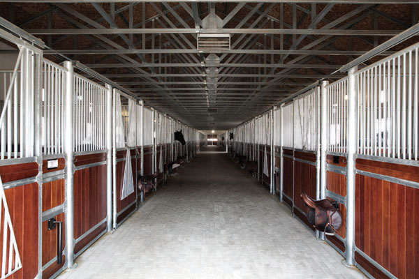 本章介紹常見的馬房和室內(nèi)訓(xùn)練場(chǎng)館建筑風(fēng)格。馬房和室內(nèi)館可以保護(hù)馬匹免受天氣的影響,所以在建筑風(fēng)格的選擇上會(huì)有地域性區(qū)別。如:在天氣濕熱的地區(qū),較為開放的結(jié)構(gòu)很受歡迎,這種結(jié)構(gòu)的馬房通風(fēng)良好,免受日照影響。寒冷多雪的地區(qū),較為封閉的結(jié)構(gòu)更受歡迎。不管天氣如何,與建筑外部天氣環(huán)境相比,內(nèi)部環(huán)境應(yīng)該更舒適,良好的通風(fēng)保證空氣質(zhì)量。糟糕的空氣質(zhì)量,會(huì)引起建筑材料潮濕、變質(zhì),并最終導(dǎo)致材料老化。建造馬房和室內(nèi)館選擇的材料要能承受高濕度、抗灰塵。 建筑框架結(jié)構(gòu)Building Framing 建筑框架結(jié)構(gòu)風(fēng)格與支撐建筑外殼的結(jié)構(gòu)材料相關(guān),而且影響馬房?jī)?nèi)部特征。建造馬房的兩種主要框架結(jié)構(gòu)為梁柱結(jié)構(gòu)和大跨度結(jié)構(gòu)。但只有后者用做建造室內(nèi)館。拱形結(jié)構(gòu)(Hoop structures)是大跨度結(jié)構(gòu)的一種,它使用的框架結(jié)構(gòu)材料和覆蓋材料要比傳統(tǒng)建筑更輕。梁柱結(jié)構(gòu)和大跨度結(jié)構(gòu)的設(shè)計(jì)便于采光,通過屋檐和屋脊的窗口通風(fēng)。 梁柱結(jié)構(gòu)Post and Beam 在馬房結(jié)構(gòu)中,梁柱結(jié)構(gòu)很常見,因?yàn)榱褐Y(jié)構(gòu)更符合馬房的結(jié)構(gòu)和馬廄隔斷。大多數(shù)情況下,梁柱結(jié)構(gòu)是經(jīng)濟(jì)型建筑,但是如果面臨改造時(shí),與大跨度結(jié)構(gòu)相比,這種結(jié)構(gòu)的缺點(diǎn)就很明顯:因?yàn)樗鼱奚遂`活性。梁柱結(jié)構(gòu)是傳統(tǒng)馬房建筑結(jié)構(gòu),從美學(xué)上講,很多人都喜歡,而且適合馬匹廄養(yǎng)。 大跨度結(jié)構(gòu)Clear Span 大跨度結(jié)構(gòu)內(nèi)部沒有柱子,不會(huì)影響到活動(dòng),是較受歡迎的馬房、場(chǎng)地結(jié)構(gòu)。與內(nèi)部有柱子和墻的建筑物相比,大跨度結(jié)構(gòu)建筑的改建會(huì)更為容易。馬廄隔板(Stall walls)需要柱子的支撐,但它不支撐上面的總體結(jié)構(gòu)。大跨度結(jié)構(gòu)建筑內(nèi)部靠桁架(truss)或剛性框架結(jié)構(gòu)(rigid frame)來支撐屋頂。桁架和剛性框架作為預(yù)制購(gòu)建產(chǎn)品購(gòu)入,可以是木制的或是鋼制的。桁架通常用在柱網(wǎng)結(jié)構(gòu)。柱子結(jié)構(gòu)或柱建結(jié)構(gòu)的柱子被打入地面, 不用混凝土基礎(chǔ)。當(dāng)跨距很大時(shí),剛架和拱很經(jīng)濟(jì)。剛架或拱與混凝土基礎(chǔ)安全地連接。木制拱通常是較為有吸引力的建筑特征。與桁架相比,不管是木制還是金屬剛架,從內(nèi)部看比較通透。剛架結(jié)構(gòu)中,屋頂?shù)慕Y(jié)構(gòu)更容易看到。桁架可作為吊頂?shù)闹谓Y(jié)構(gòu)。 |