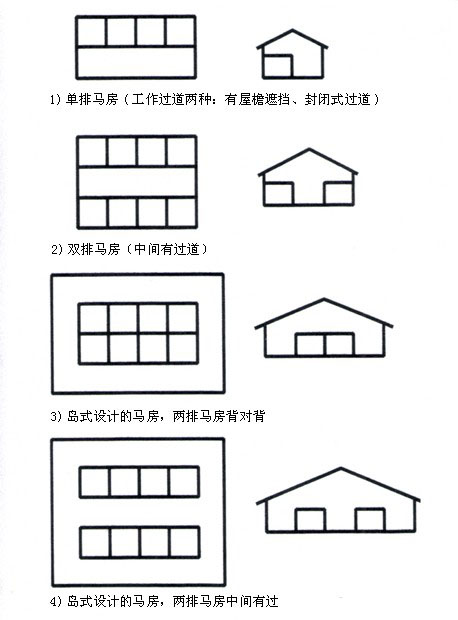 (二)馬廄布局選擇 (圖一) 根據(jù)馬廄和過道的位置,馬房平面圖(如圖一)一般認(rèn)為有三種設(shè)計(jì):?jiǎn)闻拧㈦p排或島式設(shè)計(jì)。若當(dāng)?shù)貧夂虮容^溫和,單排馬房(如圖二)比較常見,而且外面的過道對(duì)馬匹護(hù)理員來說是舒適的工作環(huán)境。當(dāng)馬匹大多時(shí)間在室外,而且可自由出入馬房,也會(huì)用到單排馬房。在美國(guó),雙排馬房(如圖三)常用做寄養(yǎng)私人馬匹和比賽設(shè)施,封閉的過道對(duì)于馬匹護(hù)理工作很重要。島式設(shè)計(jì)多用于馬匹集中訓(xùn)練時(shí),如速度賽馬,馬房周圍的“環(huán)形走道”是為了讓馬匹盡快降溫或是訓(xùn)練馬匹。 (圖二) (圖三) (1)單排馬房的構(gòu)造