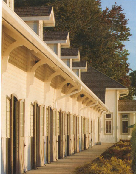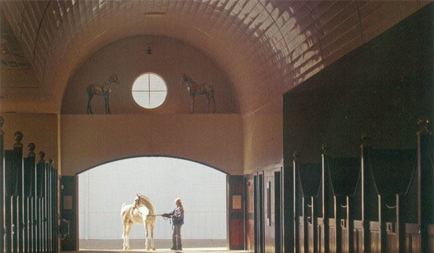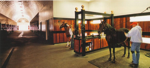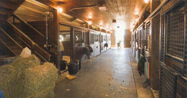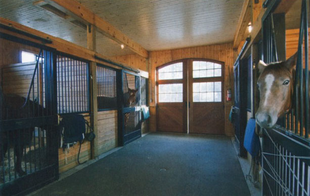 與其他兩種設(shè)計(jì)相比,單排馬房的構(gòu)造很漂亮,它最大程度地減少了封閉空間。馬匹和自然環(huán)境更接近,每匹馬都可以有稱心的馬廄。不過,除非馬房是部分封閉,否則這種馬房設(shè)計(jì)難以保護(hù)馬匹護(hù)理員免受天氣的影響。 (2)雙排馬房(過道在兩排馬廄中間)的構(gòu)造